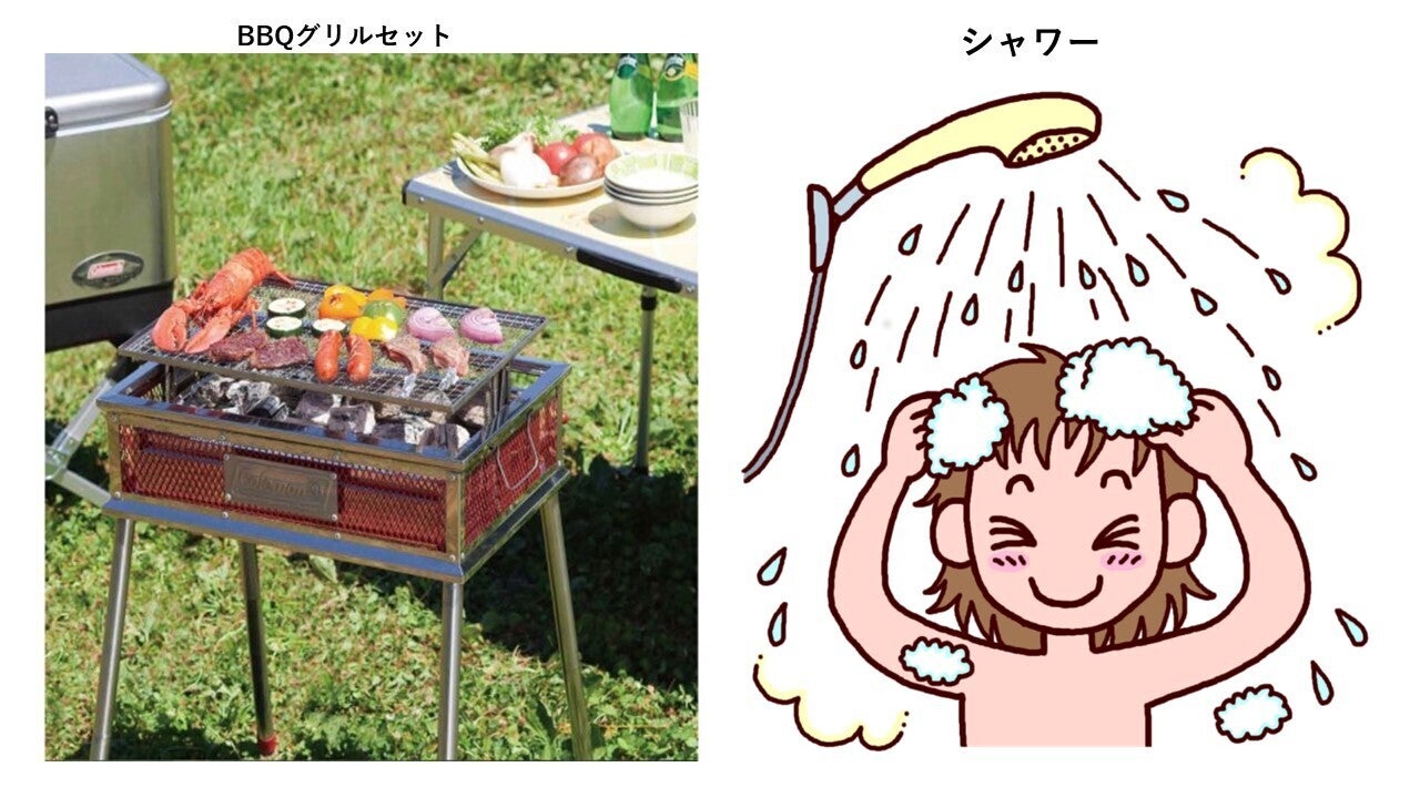 ● 基本設備:タープテント・コンセト・照明・水道・トイレ・ゴミ箱