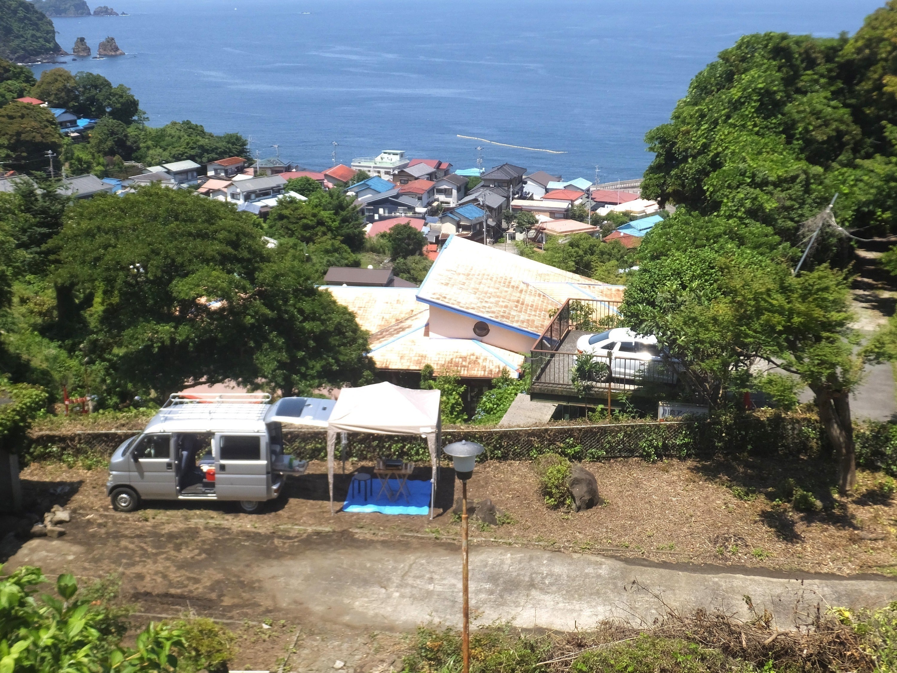 窓から見た、 車中泊予定地と川奈アイランドその奥には相模湾です。