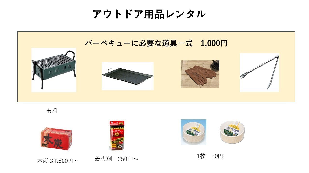バーべーキューセットは1,000円~で、炭・などは有料で食材は持ち込みです。