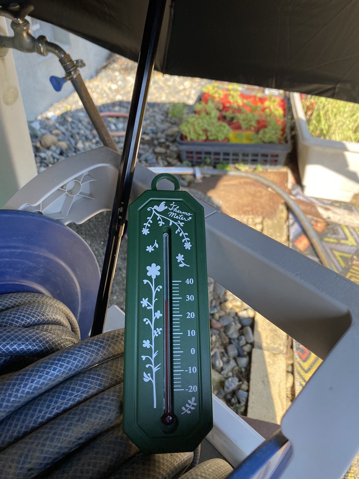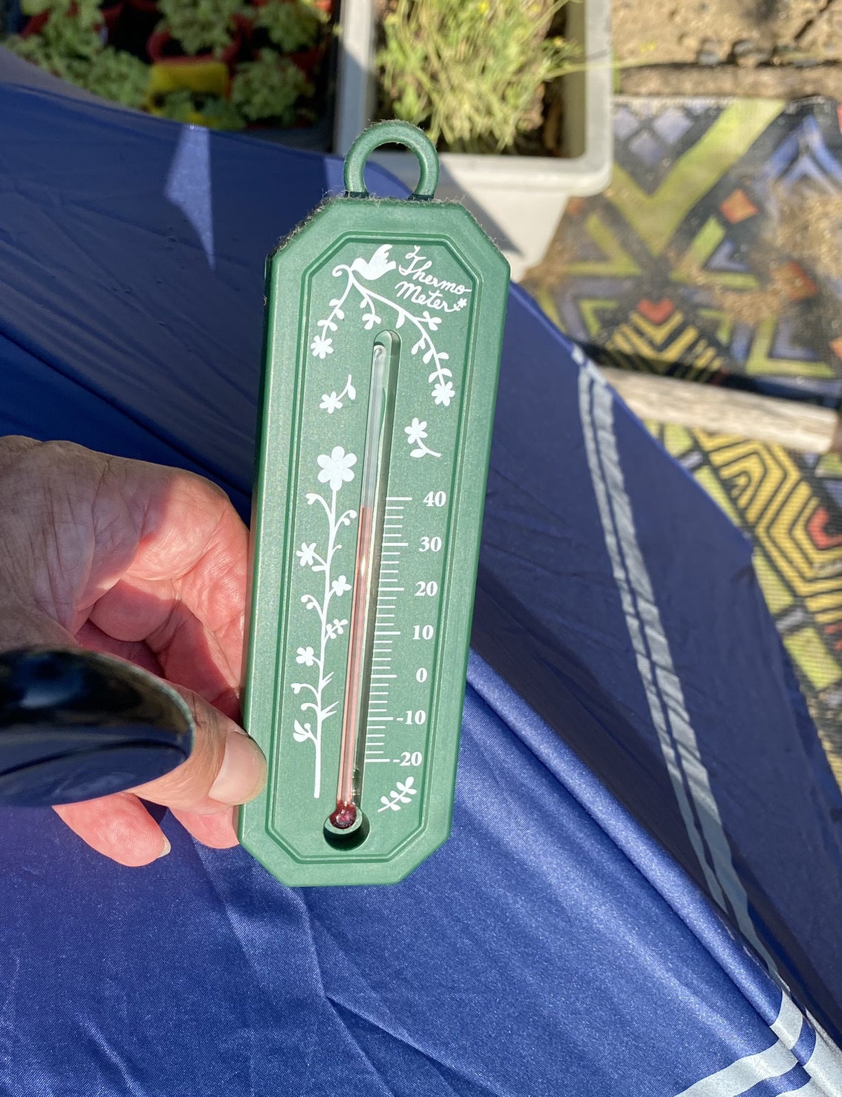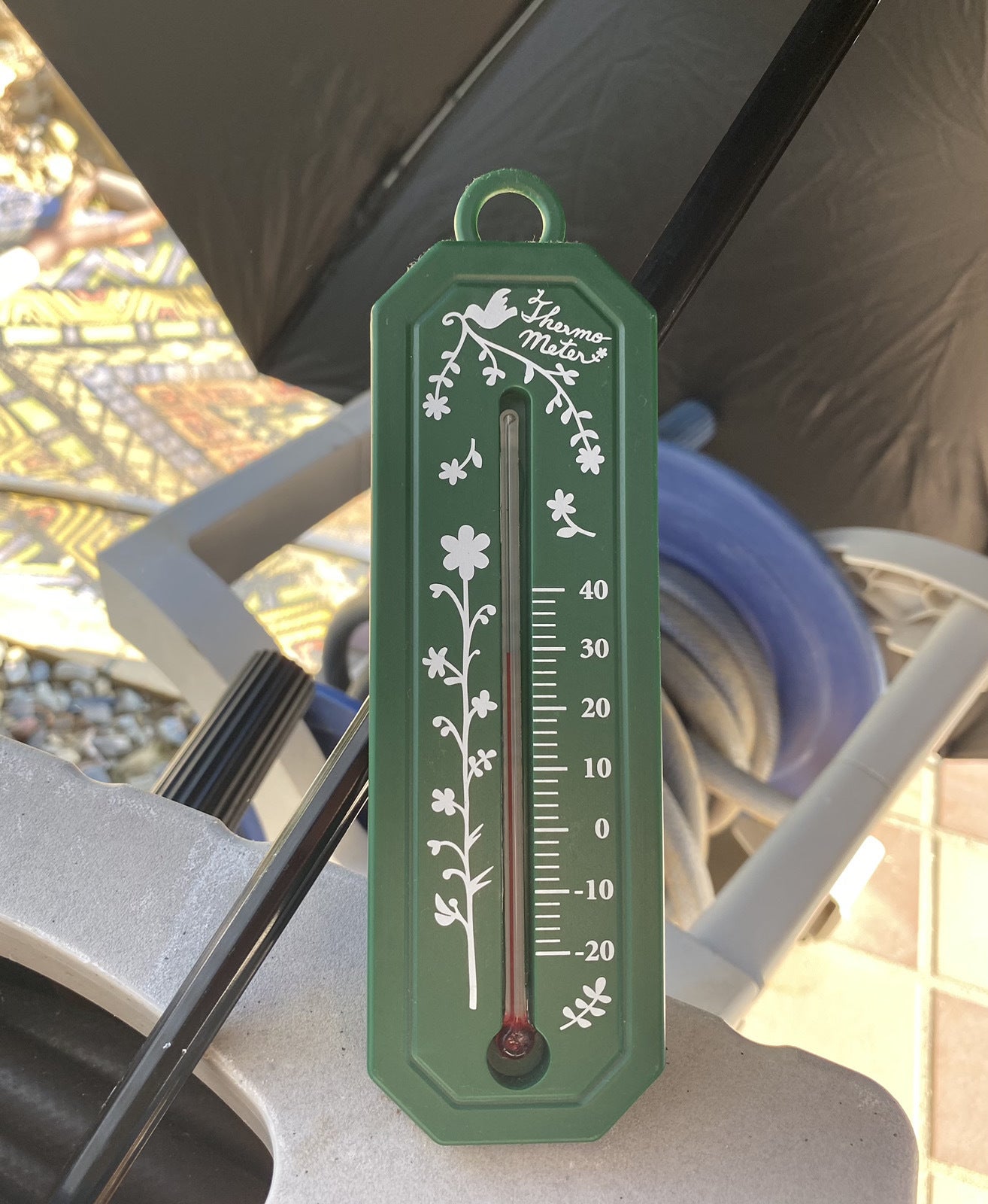 直接陽が当たってる状態の温度は38度でしたが、傘の中に暫く入れておいた気温計は29度を示していました。