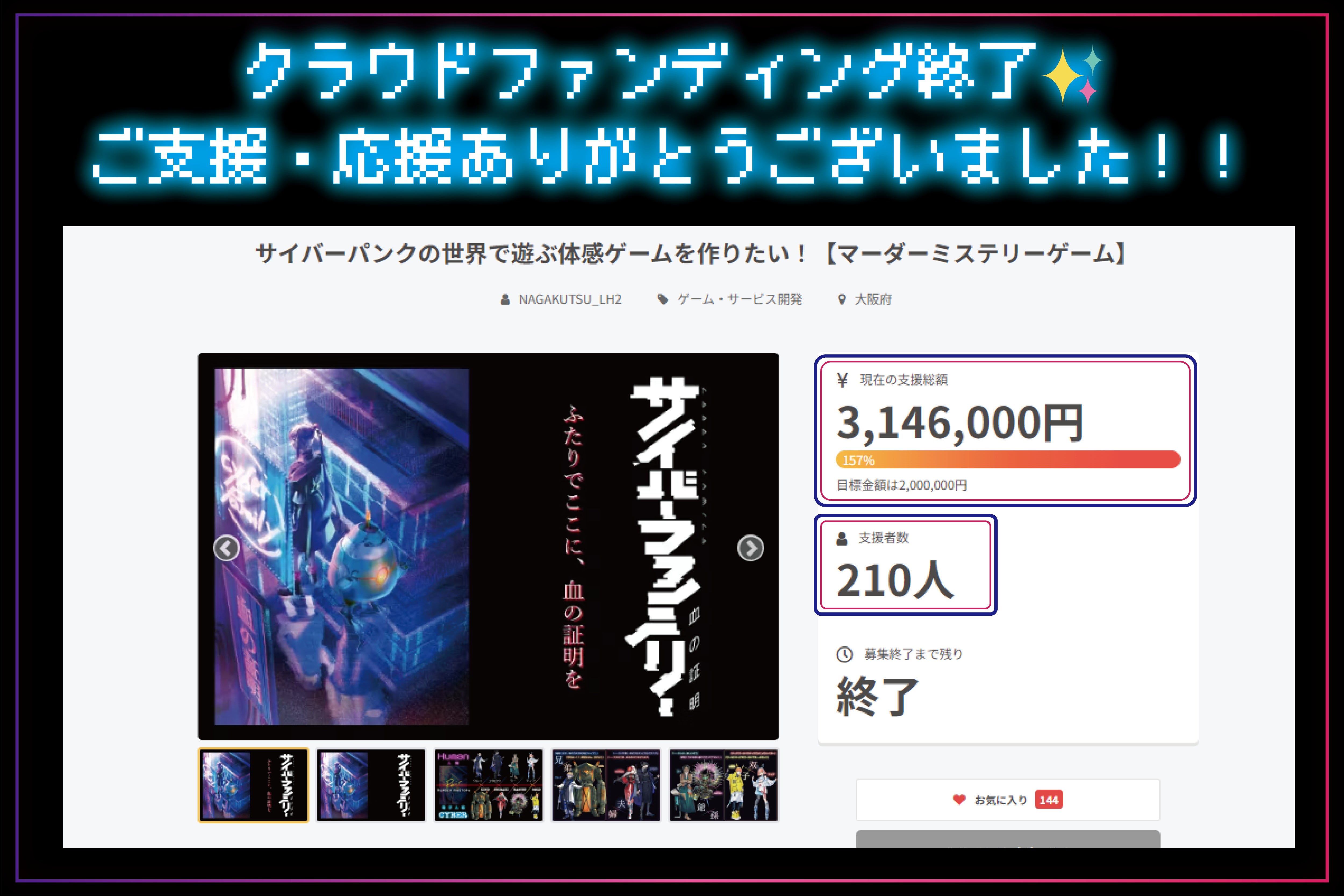 ご報告が遅くなりましたが、クラウドファンディングが無事に終了しました!支援総額:3,146,000円支援者数:210人皆様のおかげで、ネクストゴール300万円も達成!本当に、たくさんのご支援・応援、ありがとうございました!!現在は、内装工事が概ね完成し、大道具や小道具、ギミックなどを制作中!今月中には、グッズの発注や、テストプレイを行う予定です。内装の写真は、マーダーミステリーの性質上、お見せすることが叶いませんが、フォトスポットや、ゲーム開始時の部屋など、見せられる場所が完成しましたら、順次ご報告させて頂きます! 改めまして、この度は、たくさんのご支援・応援ありがとうございました!皆様、完成を是非楽しみにお待ちください!現地でお会いできることをスタッフ一同、お待ちしております!