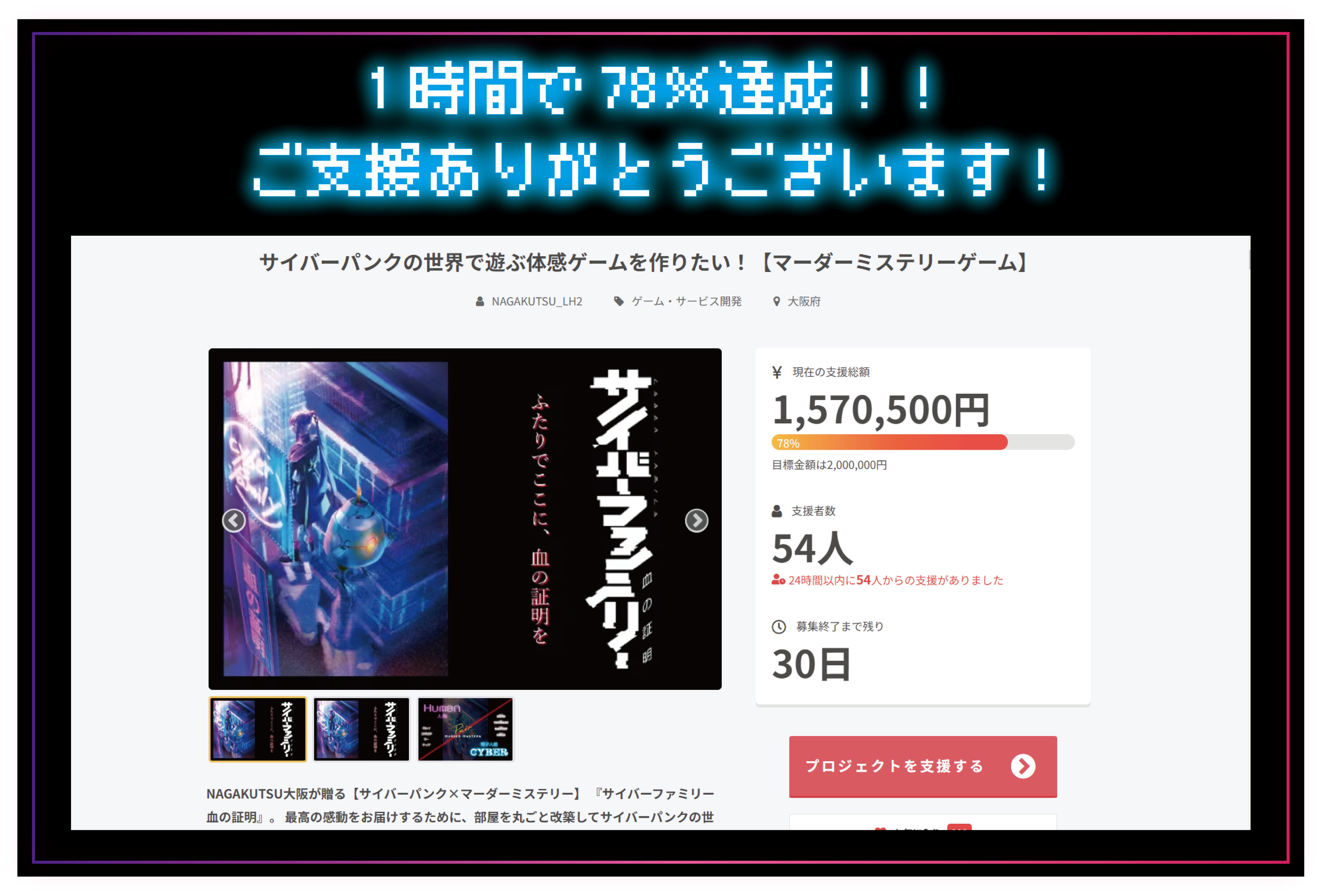 クラファン開始から4日目にして、かなりの方にご支援頂けております!金額:2,276,500円(113%)/支援者:111名沢山の熱いご支援・コメントを受け、より一層、良い物を作り上げたいという気持ちが強くなりました!また、ありがたいことに、まだまだ支援が増え続けているため、更なるネクストゴールを目指させてください!< N E X T G O A L >3 0 0 万 円 達 成 !!!もし、ネクストゴールが達成できましたら、皆様の期待を更に超えるため、「特殊機材の導入・内装の強化」に充てさせて頂きます!サイバーパンクと言えば、ネオン・電飾!資金があればあるほど、電飾が増やせます!ネクストゴール達成を目指して、リターン品も考えています。店舗SNSにて、皆様が欲しいリターン品のアンケートも取っていますので、よければコメントください。制作陣一同、10月の公演開始に向けて、精一杯頑張りますので、是非、引き続きご支援・応援のほど、よろしくお願いします!