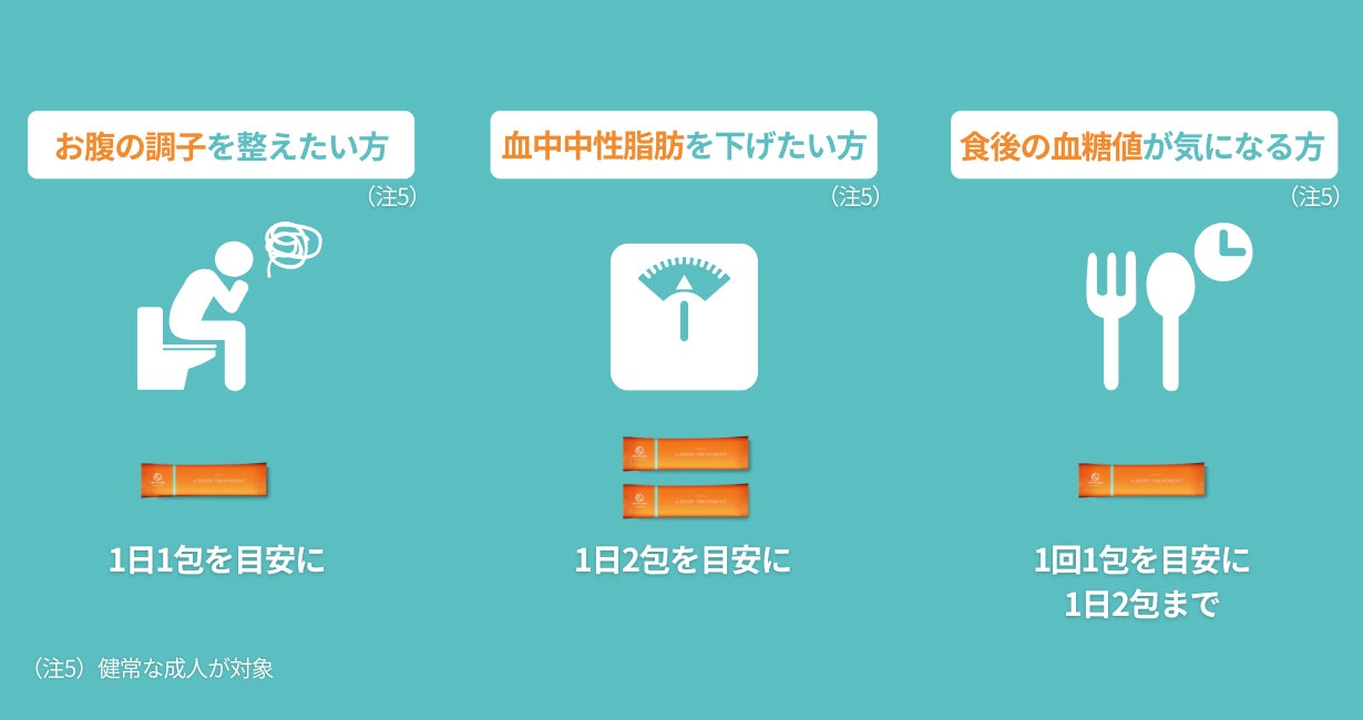 お通じを改善したい方、中性脂肪が気になる方、食後の血糖値が気になる方、それぞれの一日の目安量を守ってお召し上がりください。