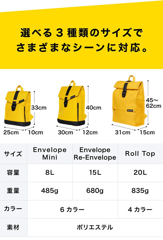 自転車に乗るときのリュックは、ずれない・蒸れない・かっこいいものを選びたい。 スポーツ用だとデザイン性に乏しく、カジュアル用だと機能性が無かったりで自転車用のリュック選びは難しい。Envelope miniなら485gの超軽量でありながらA4サイズも入る納得のバランス感。快適な自転車時間を過ごすことができます。