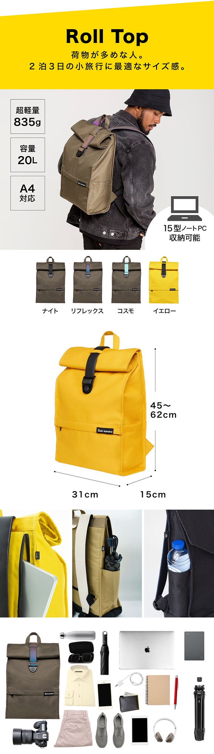 旅行といえば何かと荷物が多くなりがち。かといってスーツケースに荷物を入れて 転がしながら移動するのは面倒ですよね。ハンズフリーであればいつでもシャッターチャンスを逃すことなく旅をすることができます。Roll Topなら20Lの大容量で 機内持ち込みが可能なサイズなので荷物を預けることなくスムーズな旅行が実現可能。 大人旅の相棒に最適なリュックなんです。