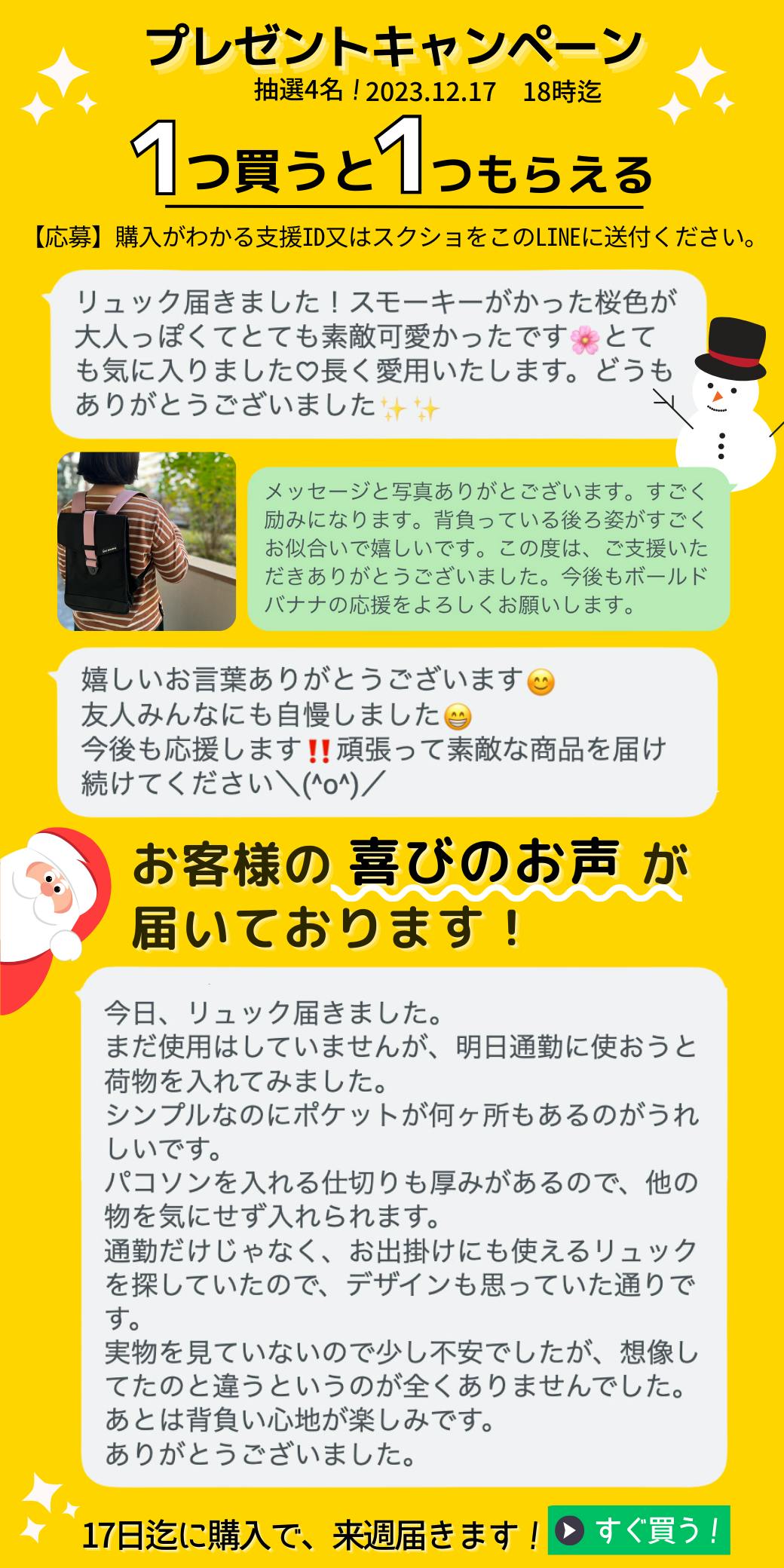 おはようございます!ボールドバナナです。今年もそろそろ終わりに近づいてきました。本日まで、たくさんのご支援頂き、誠にありがとうございます!また、多くの方から応援の言葉や商品の使用感などのお声をいただき大変励みになります。さて、まだお得な割引がたくさんあります。お買い得は今だけです。また、12/26迄にご購入で年内にお届けします!新年をボールドバナナでスタートができます。LINE登録して頂くことで、お得な早割プレゼントキャンペーン情報や最新情報をタイムリーに受信できます。お見逃し防止にご活用ください