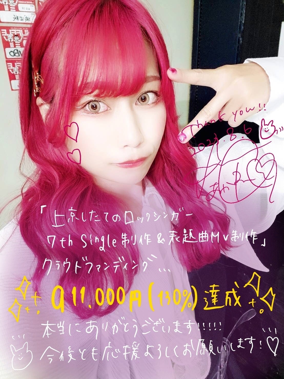 2023/08/07 15:39お世話になっております、あかねです!この度クラウドファンディングへご支援いただいた皆さん、本当にありがとうございました。無事、終了いたしまして、目標を大きく上回り911.000円(130%)を達成いたしました( ;∀;)これから急いで!早急に!爆速で!CD、リターンの製作、MVの準備を行っていきますので、お楽しみにお待ちいただけると幸いです!これからも頑張っていきます。是非応援よろしくお願いします!あかね もっと見る