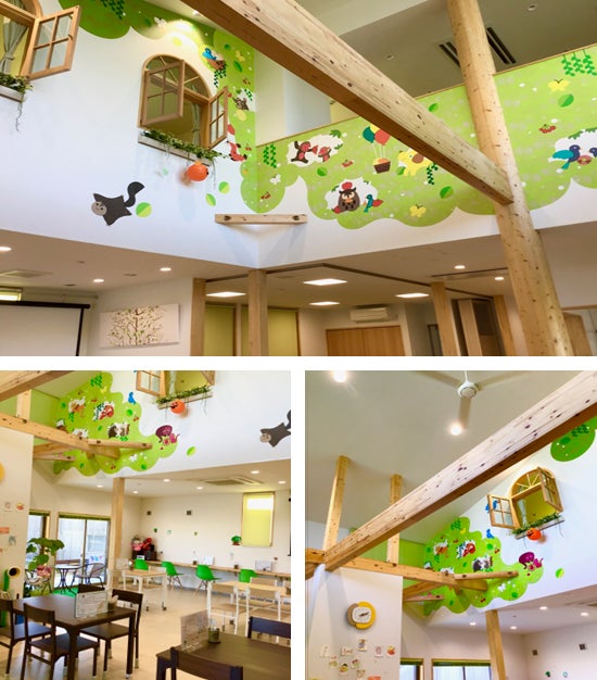 カフェの壁面には地元和歌山県紀の川市のイラストレーターロシトロカさんのイラストがちりばめられています。和歌山市民図書館の壁面に描かれていた絵に心惹かれ、子どもも大人もくつろげるカフェの壁面イラストをお願いしました。緑を基調とした、明るくわくわくするイラストに癒されてください。