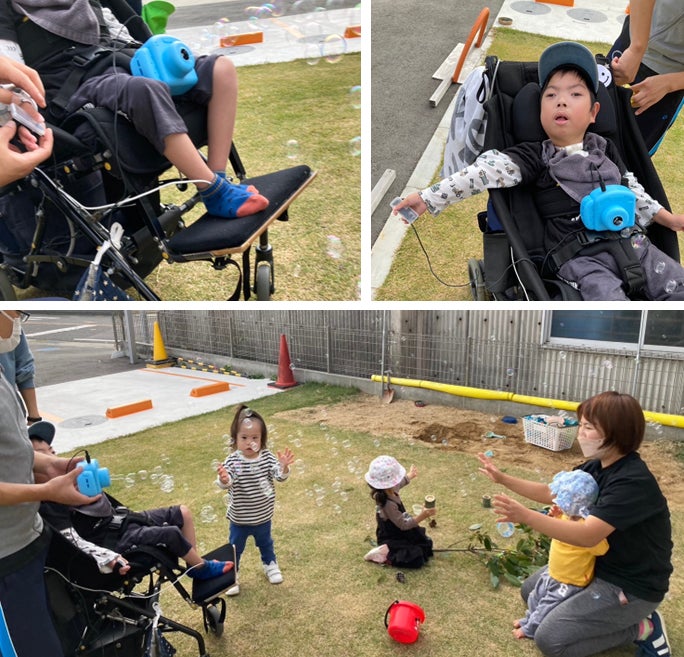 さまざまな疾患をもち、医療的ケアの必要な子どもさんが、毎日お友達とともにすごしています。日々の遊びの中で様々な工夫をこらし、運動機能、感覚機能を伸ばしていくおもちゃやメカを作って下さる事業者さんがいます。アシテック・オコさんはほんの少しの機能を最大限に生かしてくれるような様々なメカを提供してくれます。シャボン玉装置もその一つです。少しの指の動きでスイッチが押せ、たくさんのシャボン玉が出てきます。お友達も大喜びで楽しんでいます。いろんな方々に支えられながら子どもたちはすくすく成長していってます。