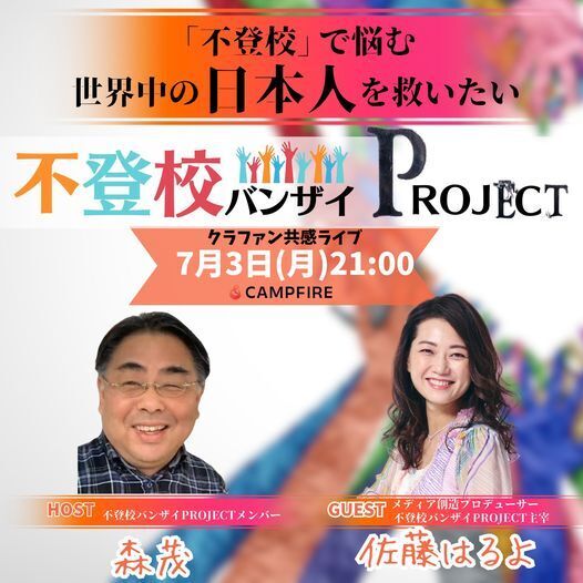 FBライブ配信しました。7月3日(月)21時~GUEST:不登校バンザイPROJECT 主宰 佐藤はるよHOST:心理カウンセラー 森 茂ご視聴こちら https://www.facebook.com/larc.en.cigel