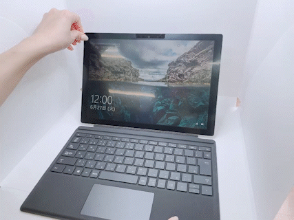 →問題ありません。一般的なマグネット式、両面貼付け式などはフィルムの厚さが500μm程度が多いですが、弊社マジックフィルムは厚さがわずか340μmとかなり薄い設計になっており、フィルムをつけたままPCなどを閉じることができます。