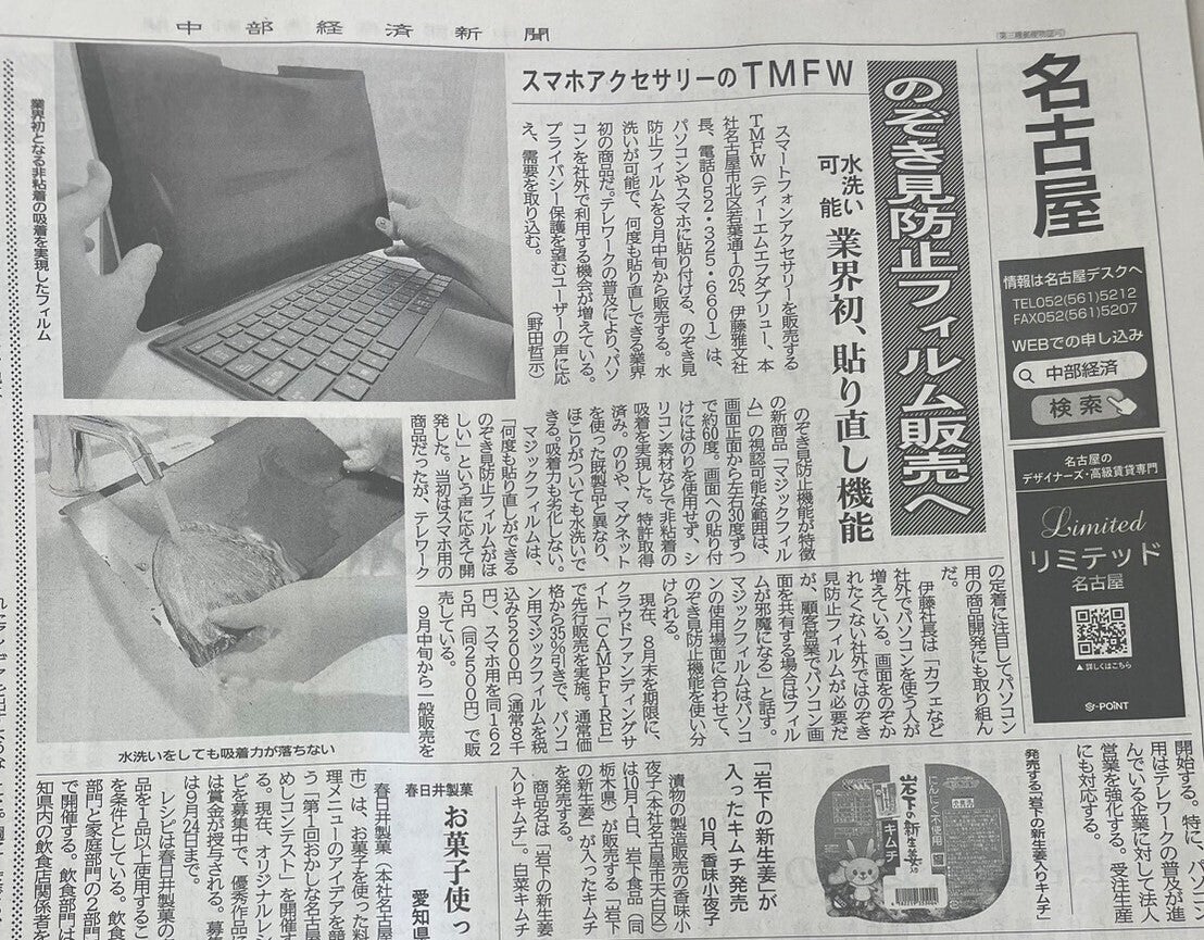 こんにちは、TMFWです!プロジェクト終了まで残り3日となりました!たくさんのご支援&応援コメントもありがとうございます!今回挑戦している『マジックフィルムのぞき見防止』が2023年8月28日発行の中部経済新聞に掲載されております。また、それに付随してYahoo!Webニュースにも掲載頂いております。https://news.yahoo.co.jp/articles/f5daf49ef9372cf9a94489b3838fc062f6629b9aたくさんの方にページを見て頂けて、大変嬉しく思います。プロジェクト公開期間は残りわずかですが、引き続き宜しくお願い致します!