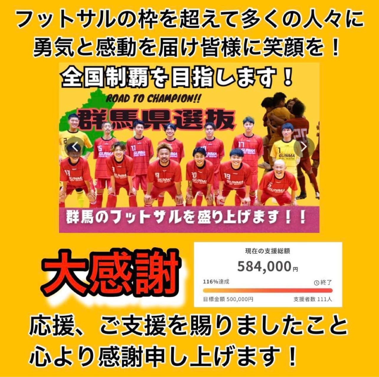 【クラウドファンディング終了!!】昨日でクラファンが終了致しました!結果は111人の方のご支援で584,000円が集まり120%達成出来ました!本当にありがとうございました!111人なんて、なんか運命感じる数字ですね!やっぱり1番ですよね!偶然でも、皆さんの気持ちが一つになり、トリプル1を達成!!正直、クラファンをやる前はこんなに集まるなんて思ってもいませんでしたが、やってみると皆さんのお陰で沢山の応援とご支援を頂き、感謝しかありません!そして、今日からはこの感謝を形に出来るように死ぬ気で努力致します!皆様に良い報告が出来るようにチーム一丸となり頑張りますので引き続き応援宜しくお願い致します!