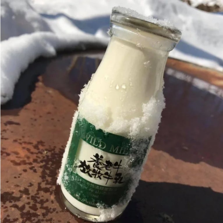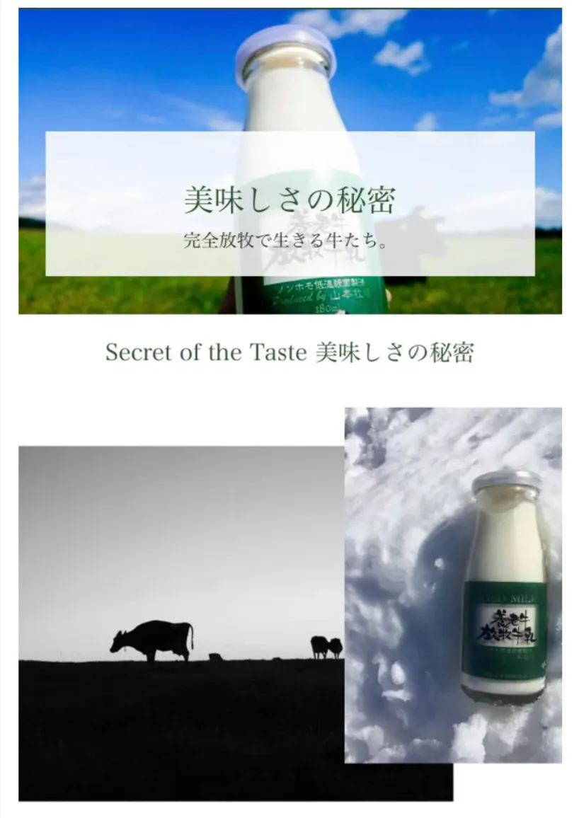 極寒の北海道の冬、その中でも知床連山の麓にある養老牛は厳しい気候風土。マイナス30度近くの猛吹雪の中、放牧された牛たちは、肩を寄せ合い厳しい夜をやり過ごします。また夏場の台風を、放牧牛たちは、広大な放牧地で強烈な風雨を体に受けながらも黙々と草を食んでいます。"厳しい環境の中で自由に育てる"というオーナーのもとこの養老牛の山本牧場の牛は、強烈なバイタリティーを持ち、その生命力が牛乳の味の輪郭を作り上げています。市販のパック牛乳とは全く異質な味をもちます。生産現場の多くの牛たちは一生外に出ることもなく牛舎の中で育てられますが、山本牧場の牛たちは、搾乳時間以外はすべて外で生活しています。穀物ではなく、草を食んで育った牛の乳
