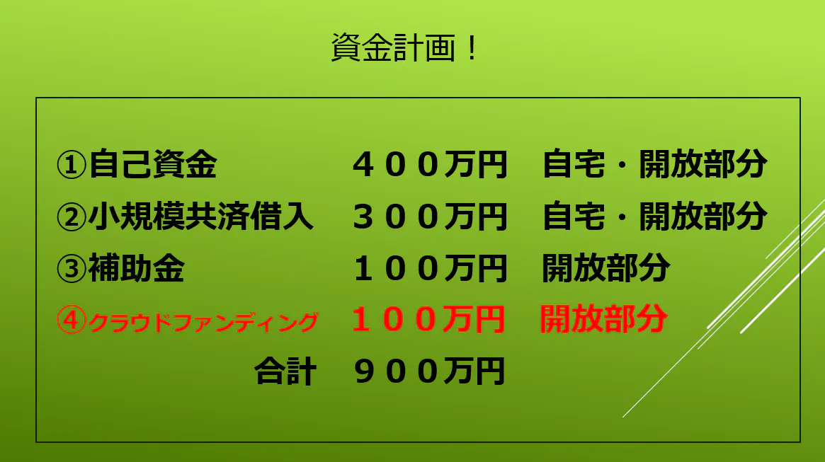 モデルケース全体で900万円かかる費用のうち、クラウドファンディングの支援金は100万円を目標にしています。