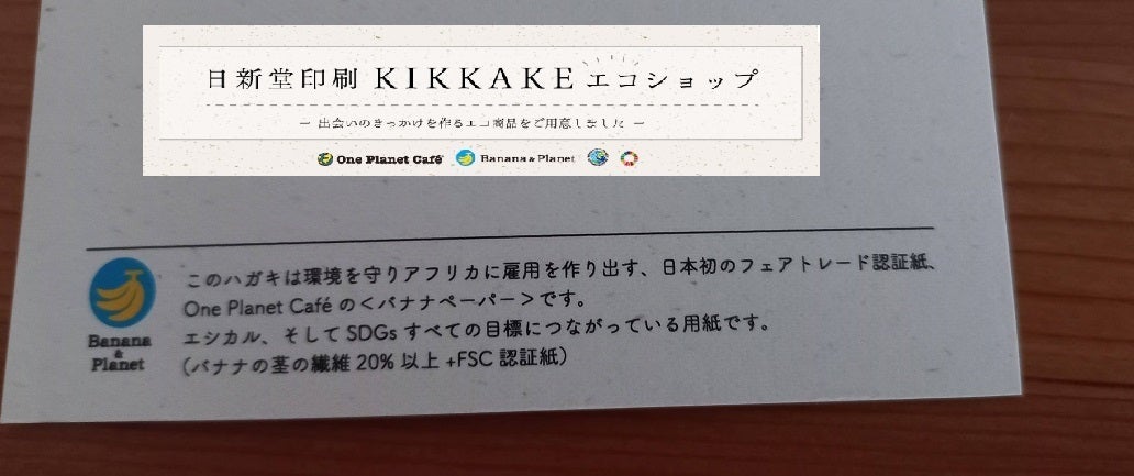 今回、お礼のお葉書、日新堂印刷さんの KIKKAKEエコショップのバナナペーパーを使わせていただきました。