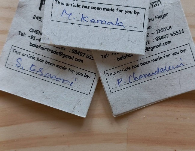 7月14日です。クラウドファンディングをスタートして2週間が経過しました。19人支援者様、ありがとうございます。 商品タグの裏に実は、創り手の名前が記入してあります。彼女達に 責任感を持って自分の作品を世に送り出してもらう、そして受け取り手の私たちは 彼女たちをアーティスト・作家・職人として尊敬するそんな、団体の試みがあります。私の将来の目標は、彼女たちともっと近づくよう彼女たちの顔もタグに記載し、状況も少し分かるといいな と思っています。