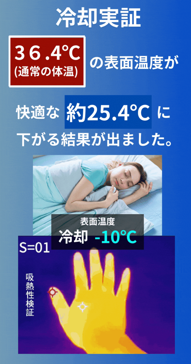 実際の冷感効果の高さを実際確かめるため、熱吸収検証を行いました。検証結果から、布団はしっかり熱を吸収し、抜群の冷感効果があることがわかりました。