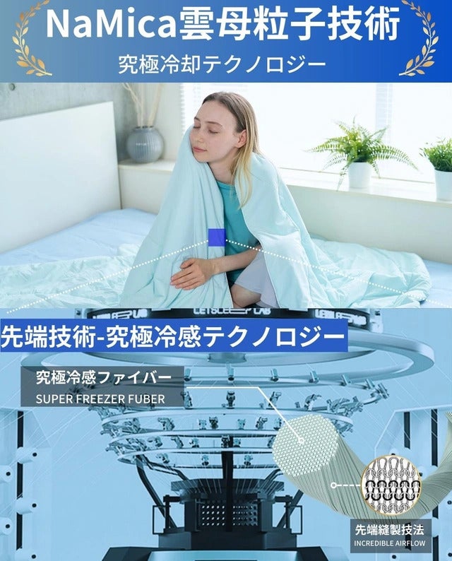 NaMica雲母粒子技術生地は、高い導熱性を持つ玉石を使って作られており、熱を素早く放出することで、高い冷感効果を発揮します。また、ナノ技術と複合糸技術を組み合わせることで、雲母繊維を作り出し、繊維の導熱性と放熱性が抜群です。