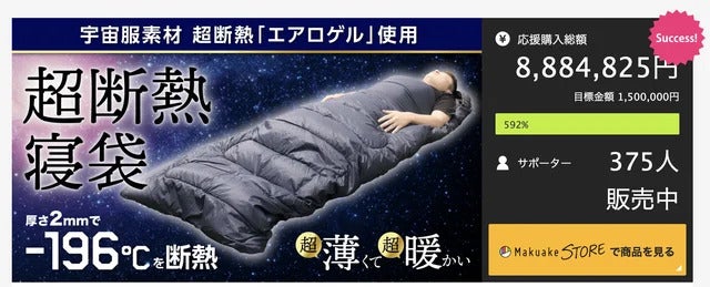 これまでは宇宙服素材のエアロゲルシリーズで、多くの支持を集め、累計1.4億円*以上の金額を達成。昨年は、エアロゲル素材を使用したオールインワン掛け布団「INFINITY WARM」が大人気で、1,400万円以上の支援を集めました。(*自社EC販売などを含む)