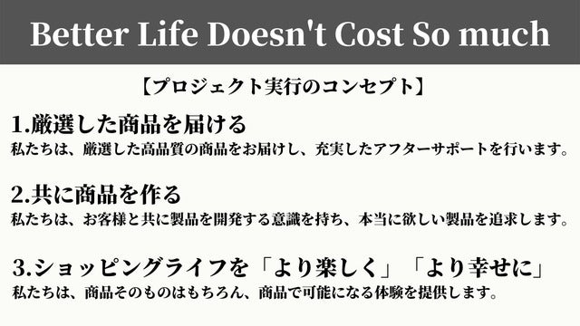 ●キャンセル・返品: 当プロジェクトは「All-or-Nothing型」の為、期間内に目標金額を達成した場合に、ご契約が成立いたします。その為、お客様都合による返品・キャンセルはできませんのでご注意ください。尚、製品到着後に破損や初期不良がある場合には交換させていただきますので「メッセージで意見や問い合わせを送る」から、または納品書記載の連絡先までお問い合わせください。