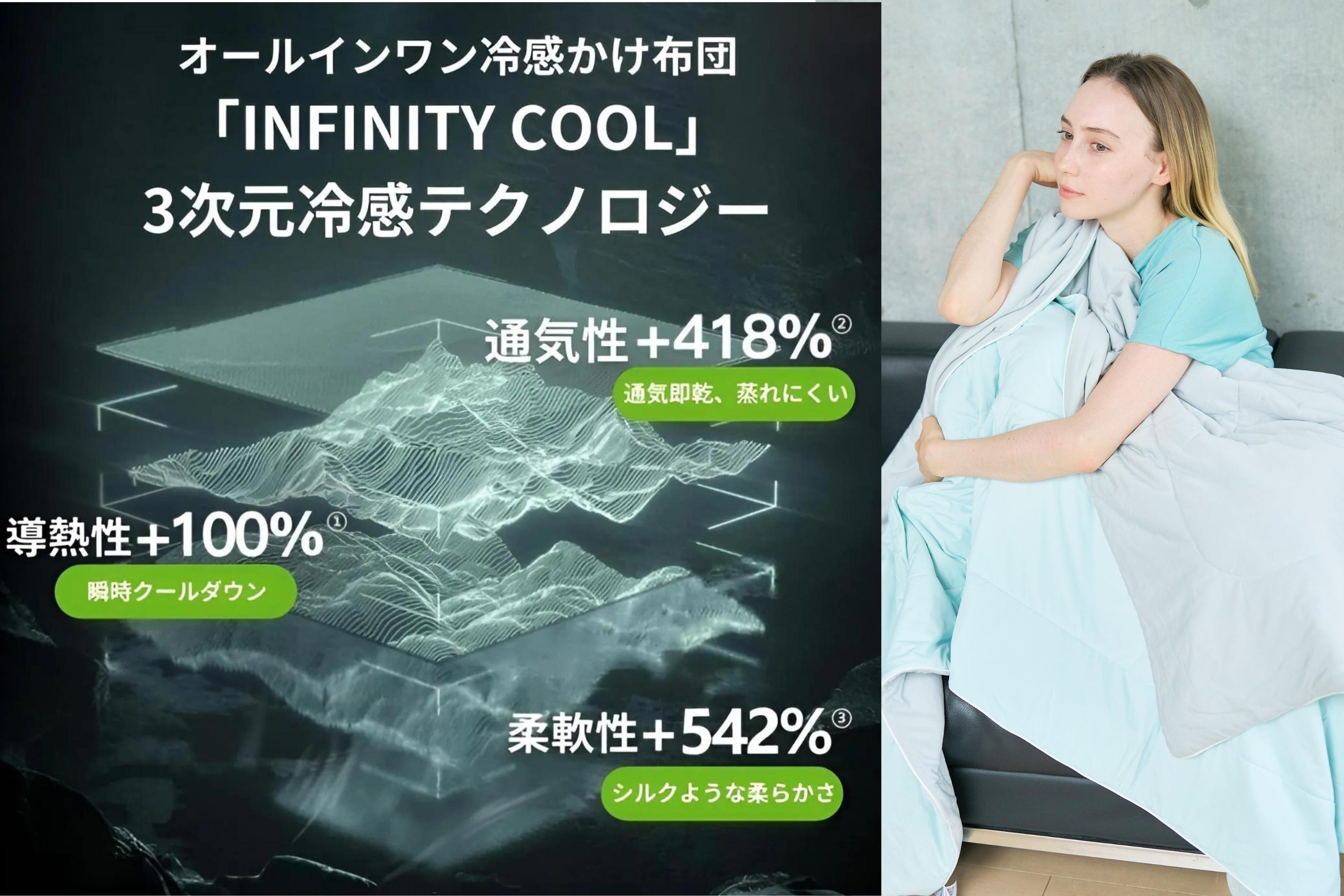 冷感掛け布団「INFINITY COOL」は3次元冷感テクノロジーで、体の熱を吸収だけでなく、さらに驚異な通気性で熱を放出し、ひんやりとした気持ちで朝まで快適に!