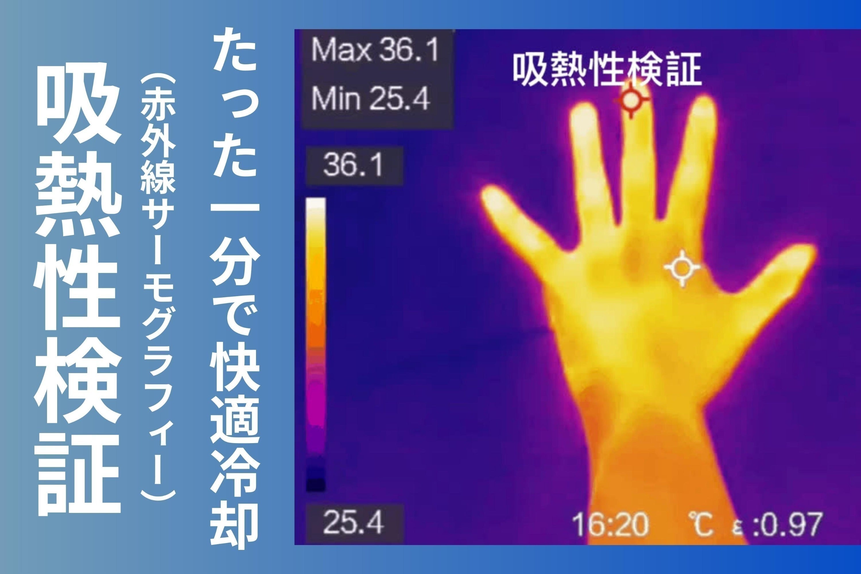 ※表面温度測定: 通常体温(36.4度)の人の手を生地に5秒間当て、手を離した直後の表面温度をサーモグラフィーカメラで測定した。(環境:室温27°度、湿度50%)