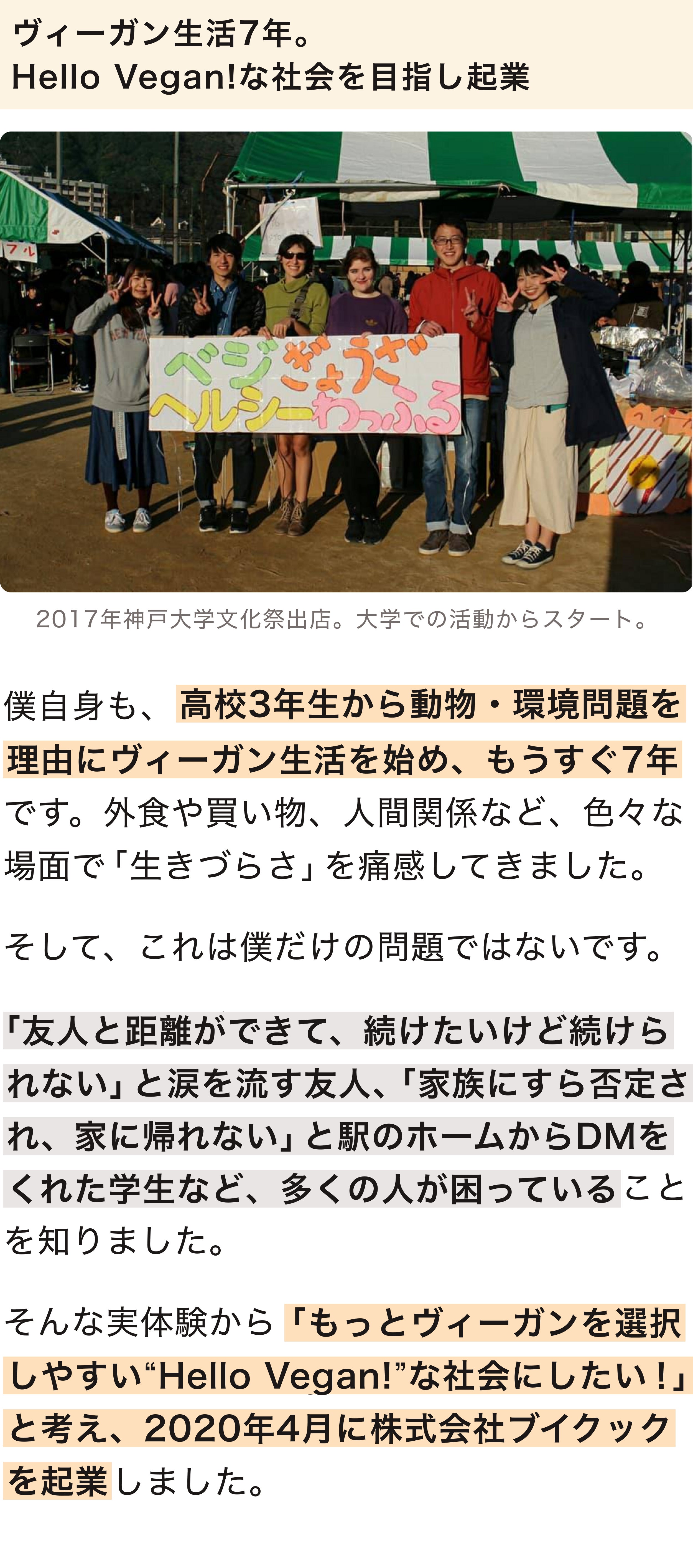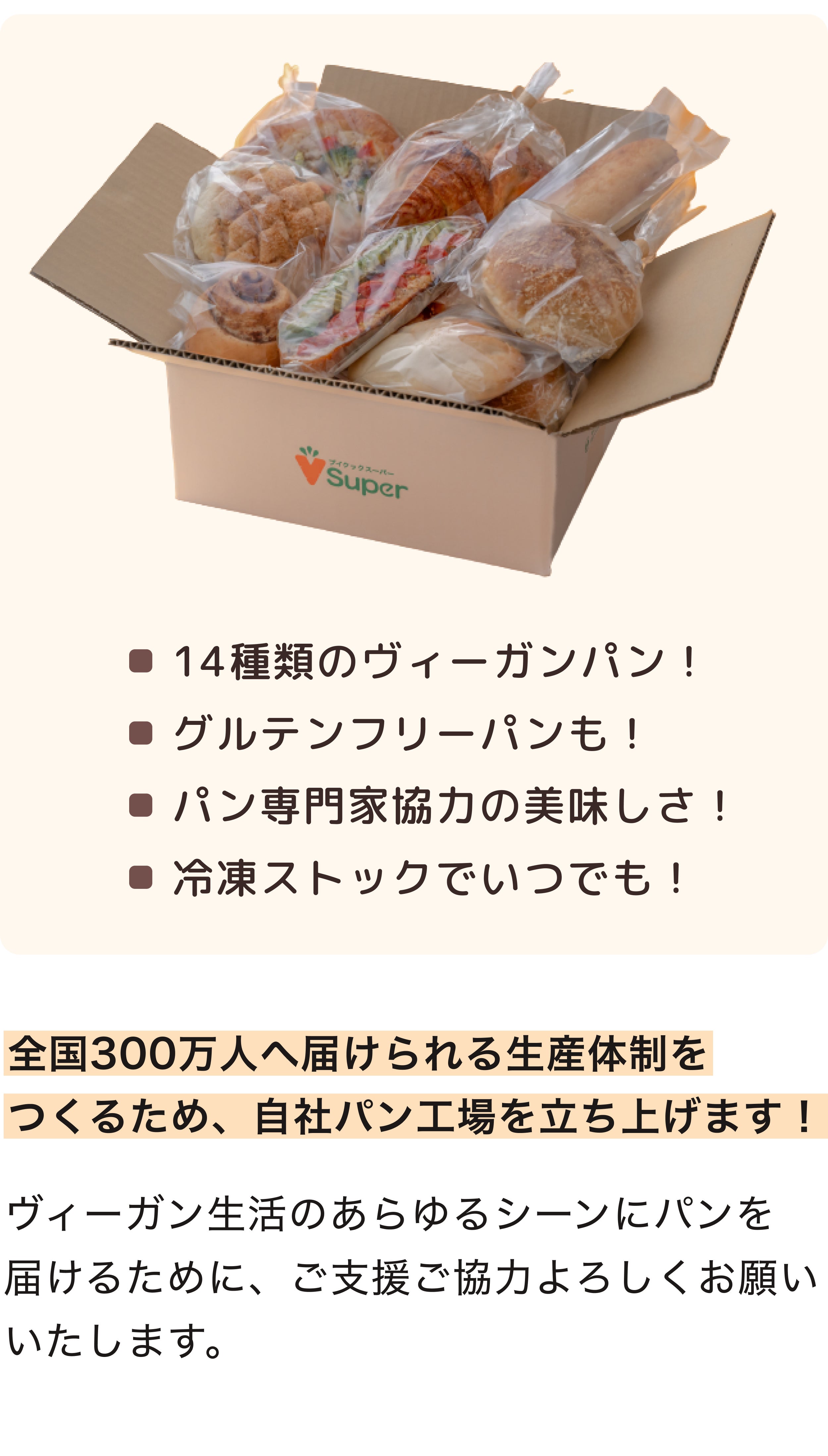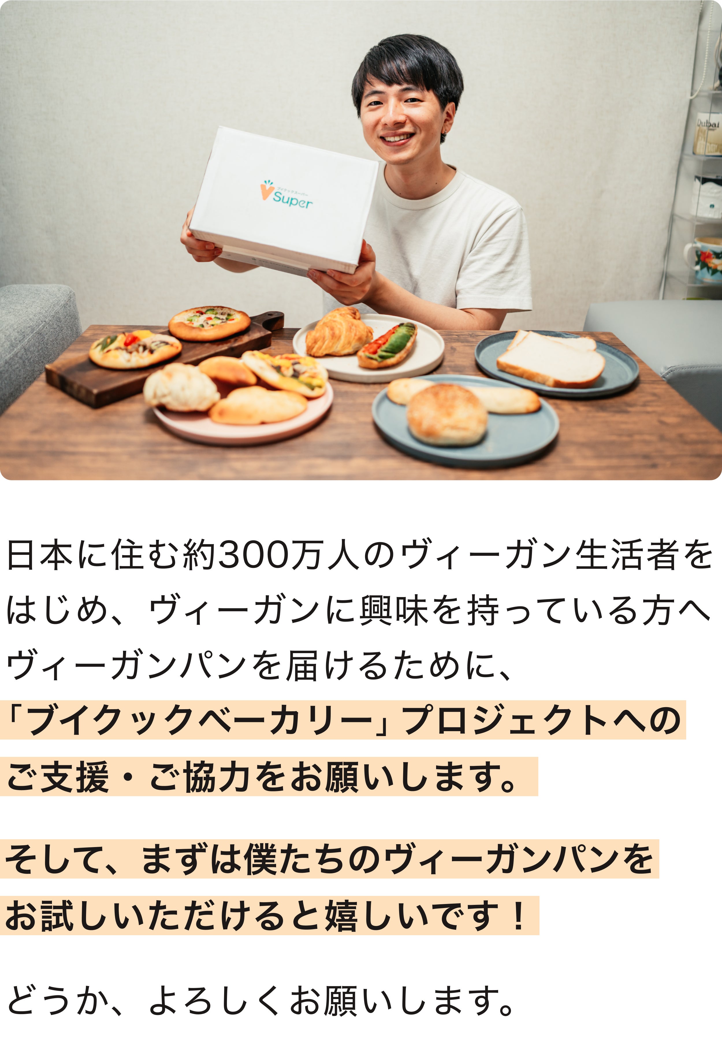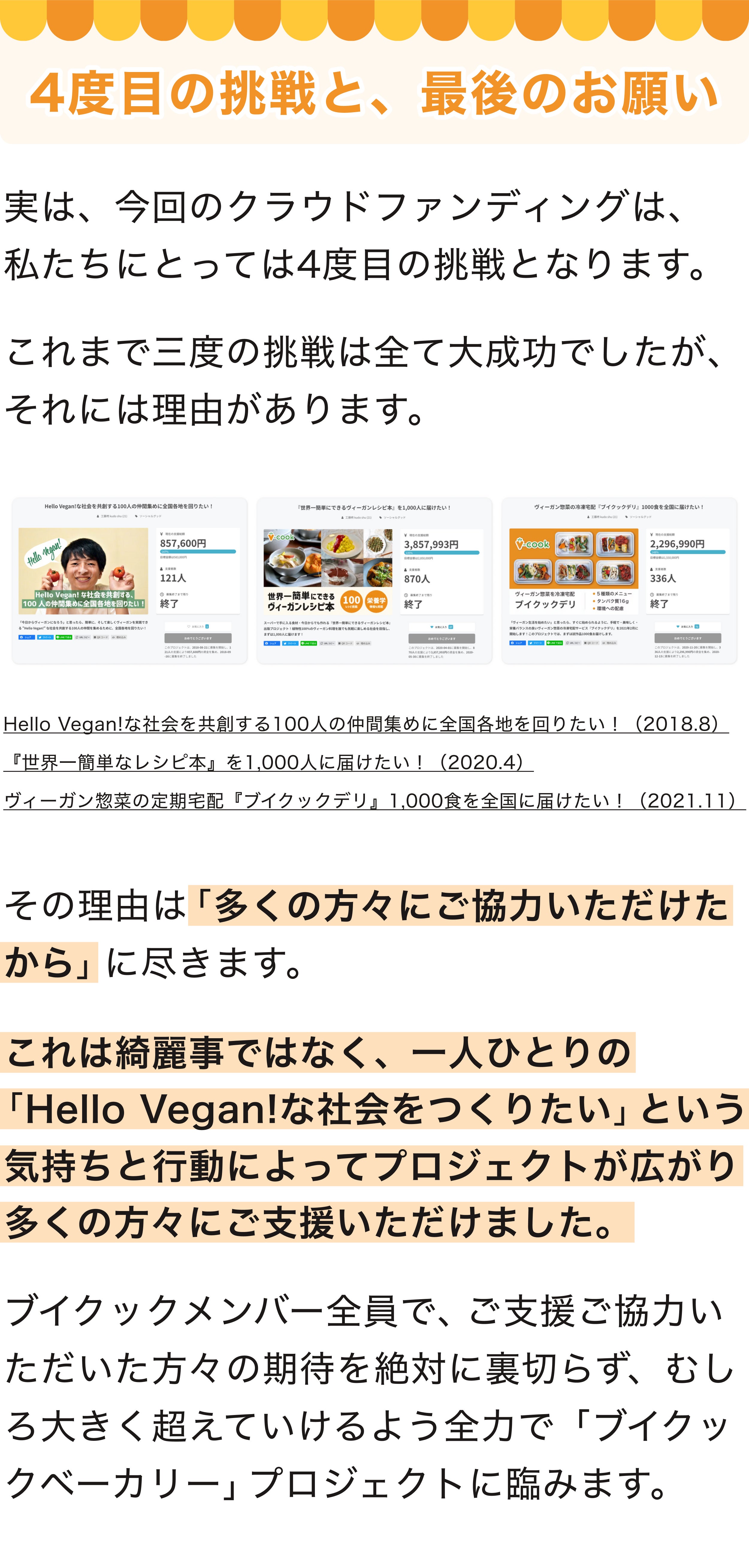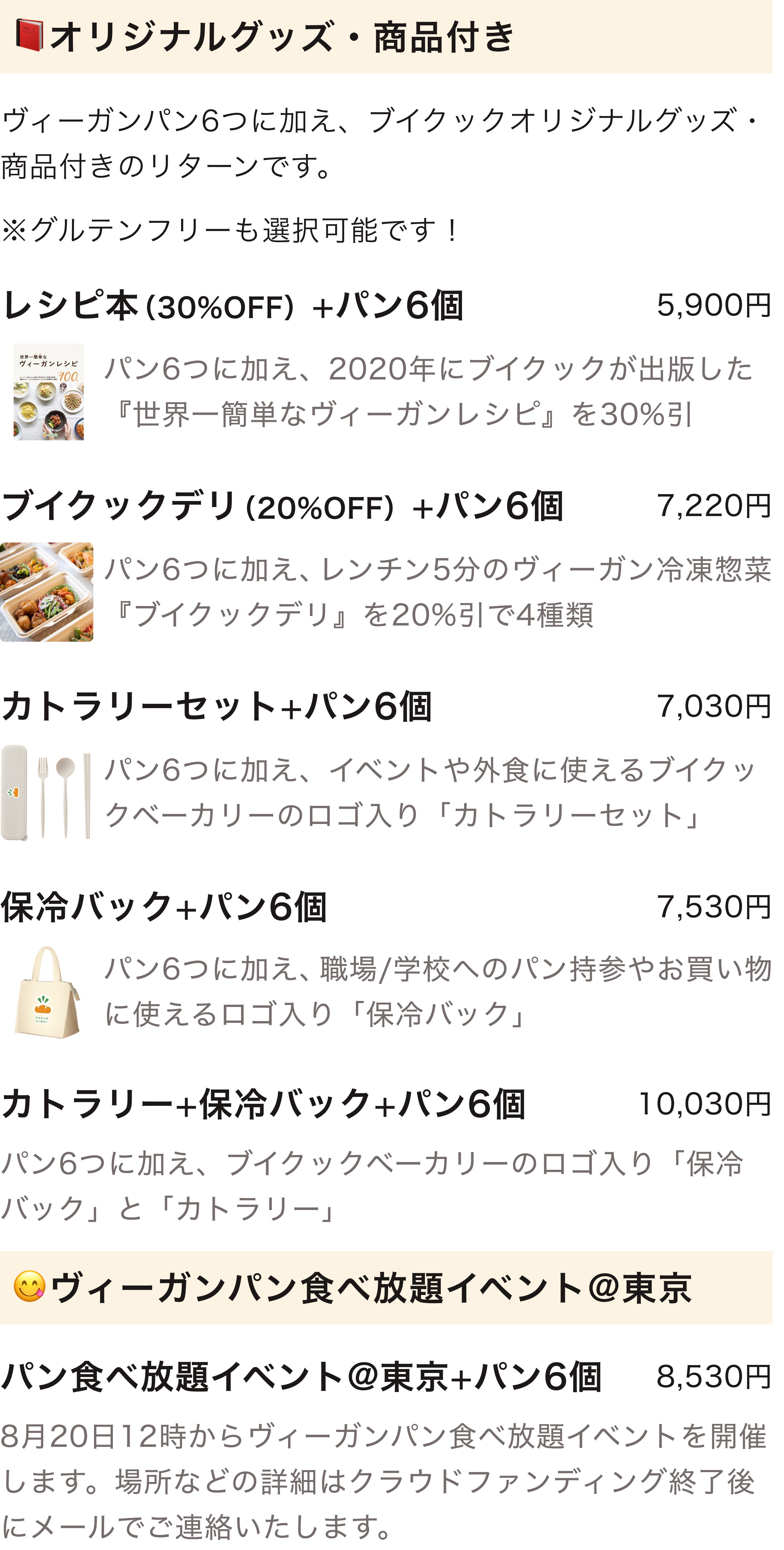 2023/07/22 22:59夜遅くに申し訳ありません。ブイクックの工藤柊です!応援してくださる皆様にお伝えすなければと、活動報告を緊急で書いています。なんと、100%達成しました...!!!ご支援いただいた皆様、SNSシェアいただいた皆様に、改めて感謝です。ひとまず、一安心しています。ヴィーガンパンを日常にするために、こんなにも多くの方に共感・支援いただけて、本当にありがたいです。明日23:59までに、300人を目指して。そして、今回のクラウドファンディングの本来の目標である、「ヴィーガンパンを300人に届けること」を目指して、明日の23:59まで頑張り続けます!のこり15人に支援いただけるよう発信など頑張り続けていきます。最後まで、ご協力よろしくお願いします!(明日は、ビーガングルメ祭りにも出店していますので、もし見かけることがあればお声がけいただけると嬉しいです。) もっと見る