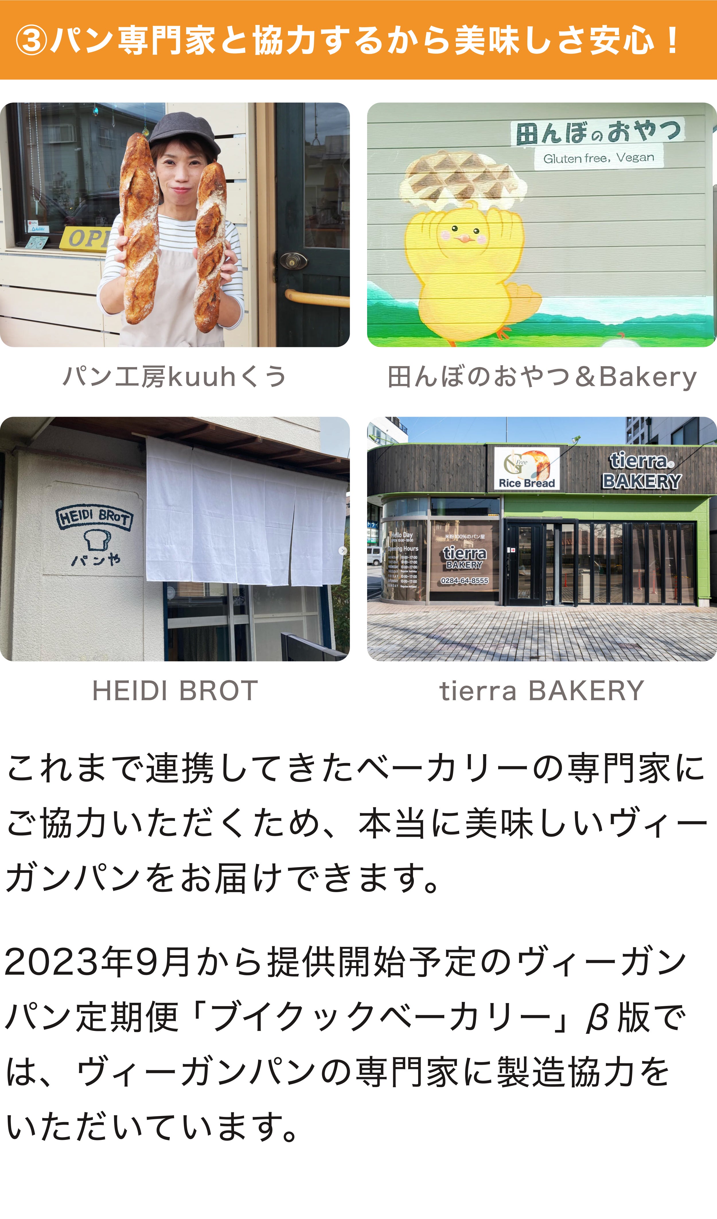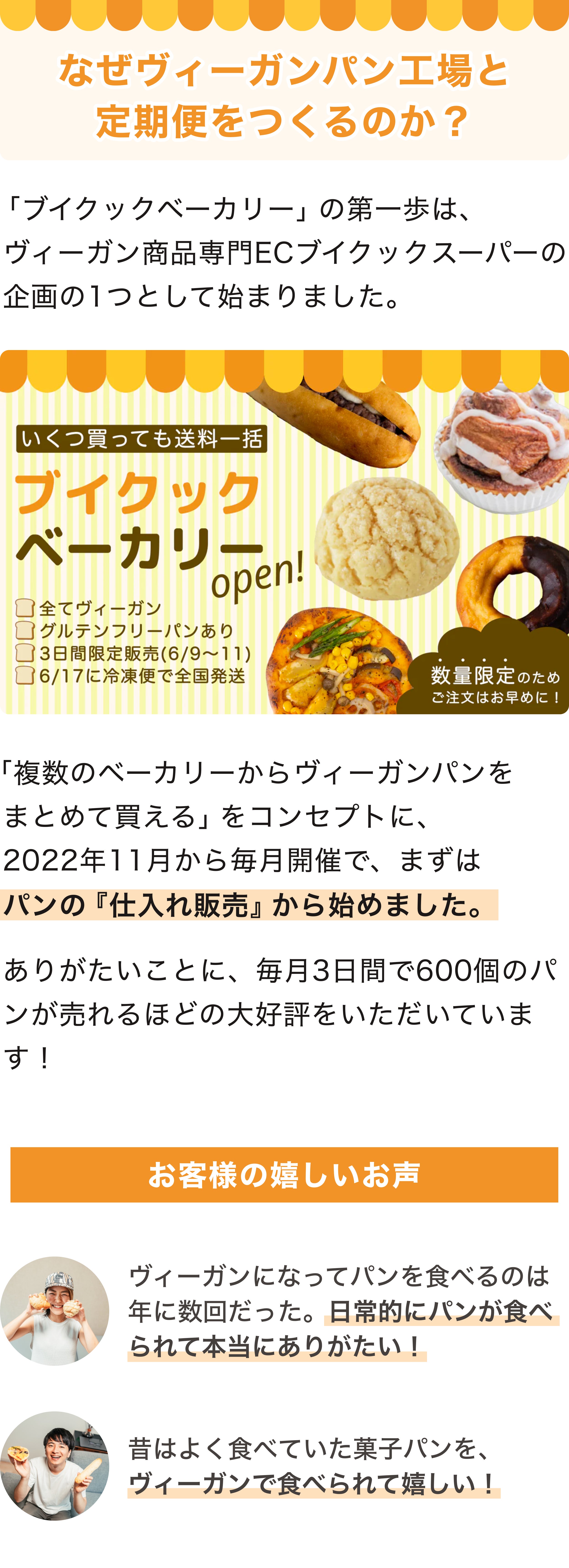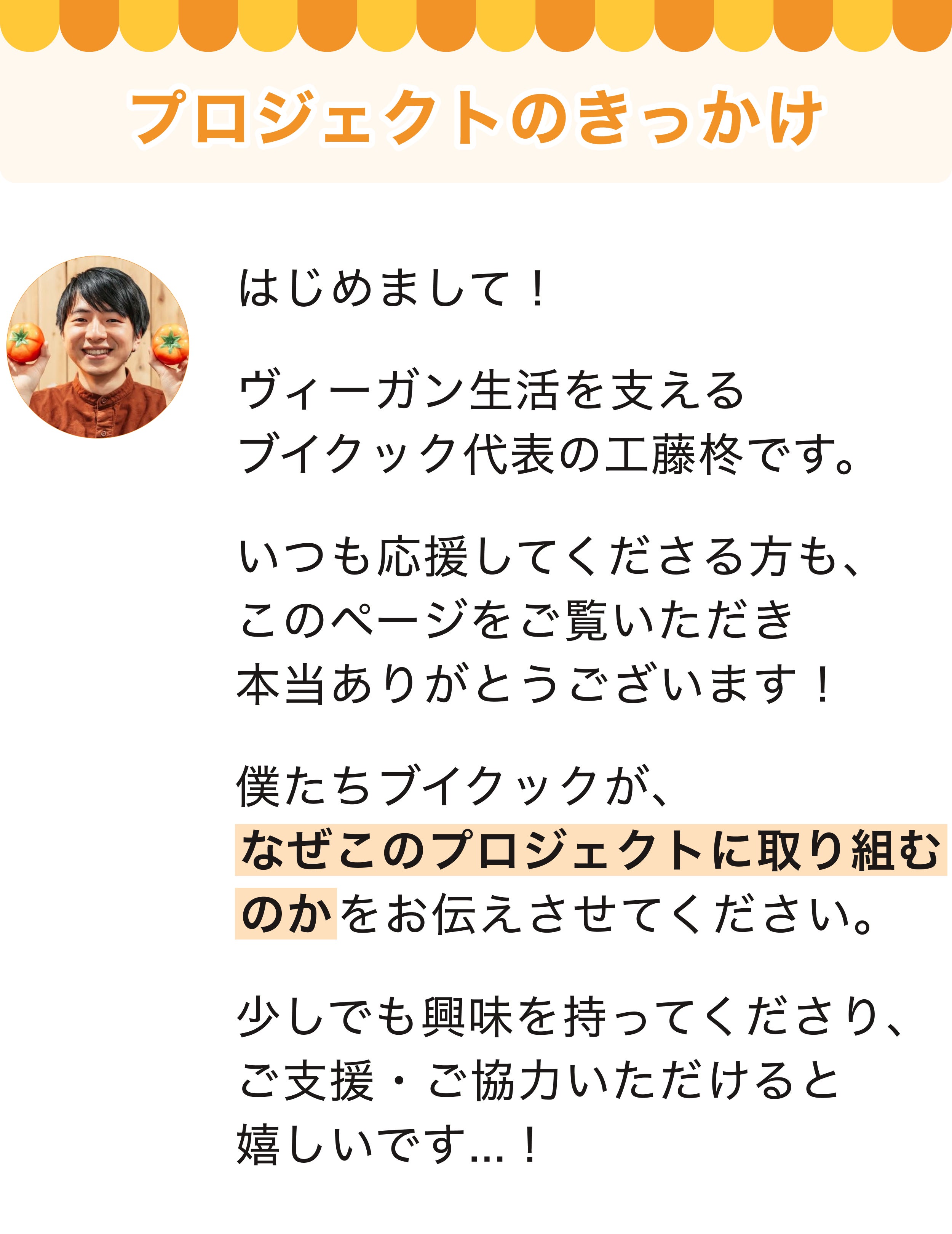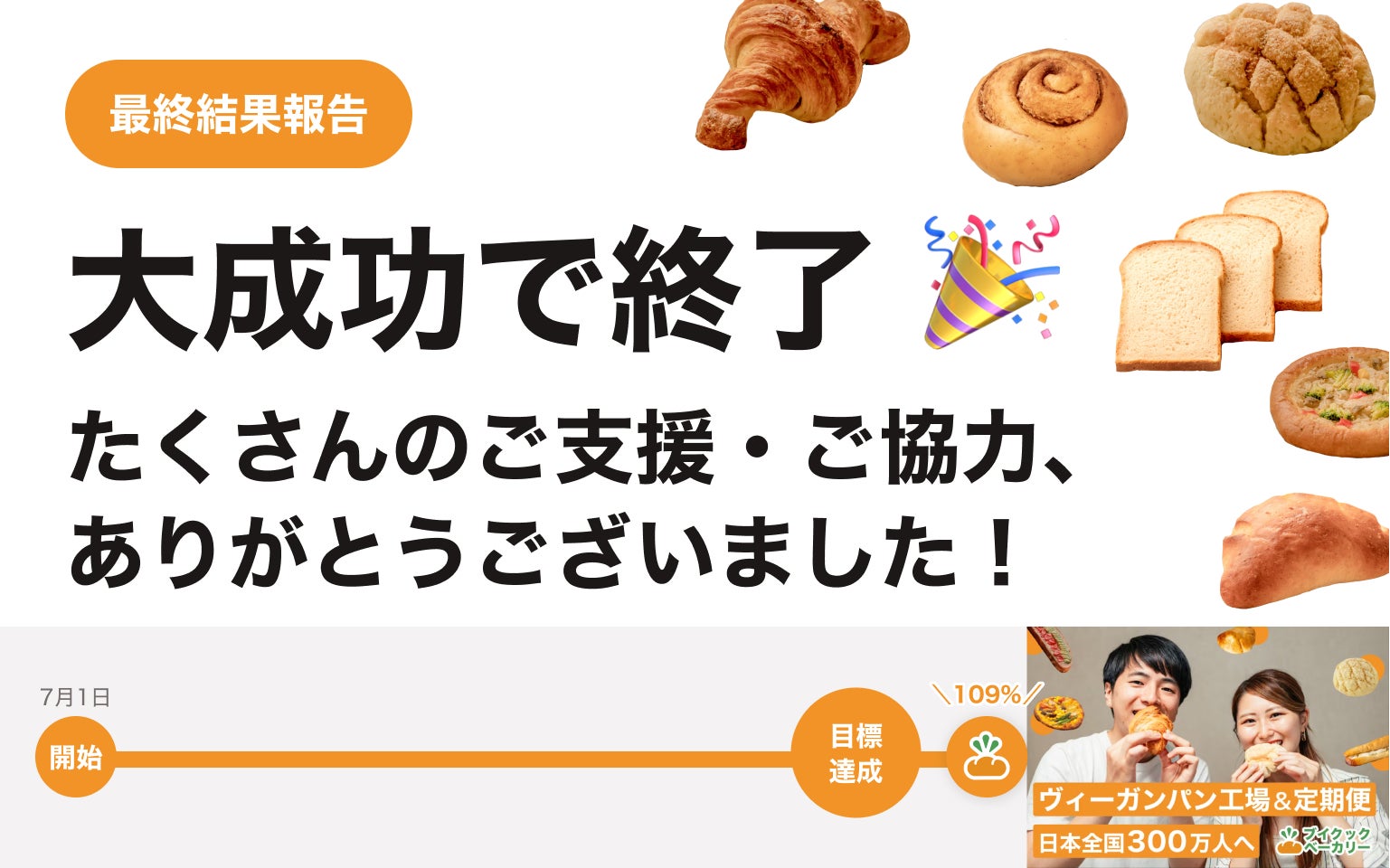 2023/07/24 15:51支援者の皆様、見守ってくださった皆様、ブイクックの工藤です!ヴィーガンパンの工場&定期便「ブイクックベーカリー」のクラウドファンディング、昨日7月23日をもって終了いたしました。最終的な結果は...・支援者数:314人(目標300人達成!)・支援金額:1,891,900円(目標172.2万円達成!)・達 成 率 :109%と、大成功で終了しました!!支援いただいた300名以上の皆様、そして期間中にたくさんのシェアでご協力いただいた皆様、本当にありがとうございました。おかげさまで、金額目標・人数目標をどちらも達成することができました。「ブイクックベーカリー」のアイデアに、こんなに多くの方に共感・応援いただき、間違いないと確信しました。今後、サービス立ち上げ・拡大するために全力で取り組んでいきます!ご支援いただいたリターンについては「7月下旬〜9月」にお届けします。当初、8月までを予定していましたが、支援を多くいただいたことから、一部9月にわたってしまうことをご了承ください。ぜひ、冷凍庫を空けてお待ちいただけると幸いです!ヴィーガンパンの定期便「ブイクックベーカリー」は、8月中旬にβ版リリースを予定しています!ヴィーガンパンを好きな種類・好きな個数を選んで、定期購入することができます。β版(テスト版)となるため、人数が50名限定ほどになる予定です。リリースの前に、支援者の皆様に優先的にお知らせさせていただきますので、ぜひメールをお待ちいただけると幸いです。改めて、今回のクラウドファンディングをご支援いただき、シェアのご協力をいただき本当にありがとうございました。最後の土日はイベントに足を運んで、実際に「支援しました!」「LINEで友だちに紹介しました!」という声を聞き、多くの方に支えられていることが身に沁みました。もっと頑張ります。そして、クラウドファンディングの成功は、ブイクックベーカリーの第一歩目です。定期便(β版)をリリース、パン工場の立ち上げ、パン職人探し、飲食店やホテルへの導入、スーパーへの卸売など、これからもさらに大きな挑戦が続いていきます。今後も、ご協力をお願いし、助けていただくことがあるかもしれません。(あるはずです)支援いただいた方々にとっても、クラウドファンディングは「ブイクックに関わる1歩目」となり、今後も「誰もがヴィーガンを選択できる"Hello Vegan!"な社会」を一緒につくっていただけると心強いです。これからも、よろしくお願いします!本当に23日間ありがとうございました。ブイクック 工藤柊 もっと見る