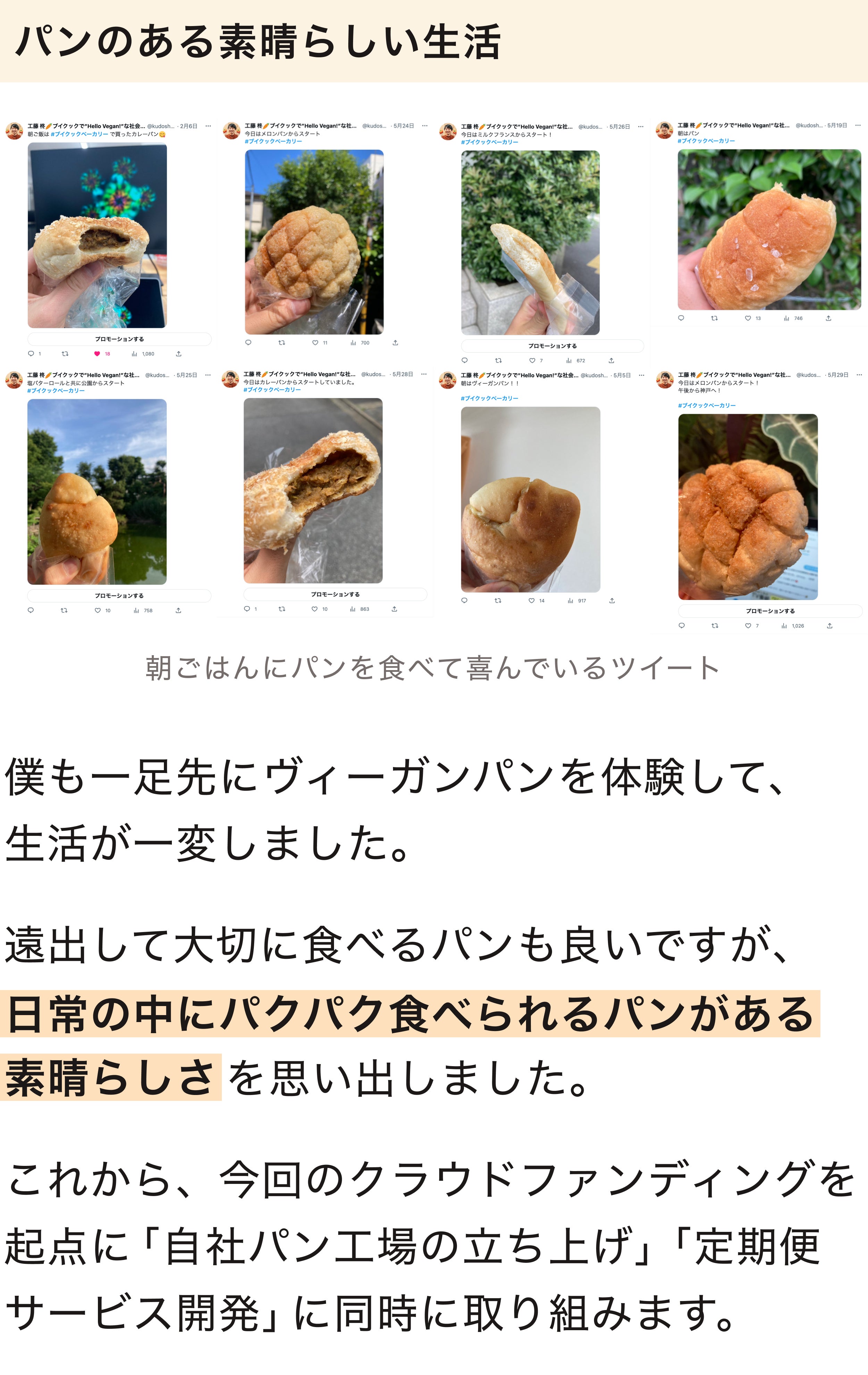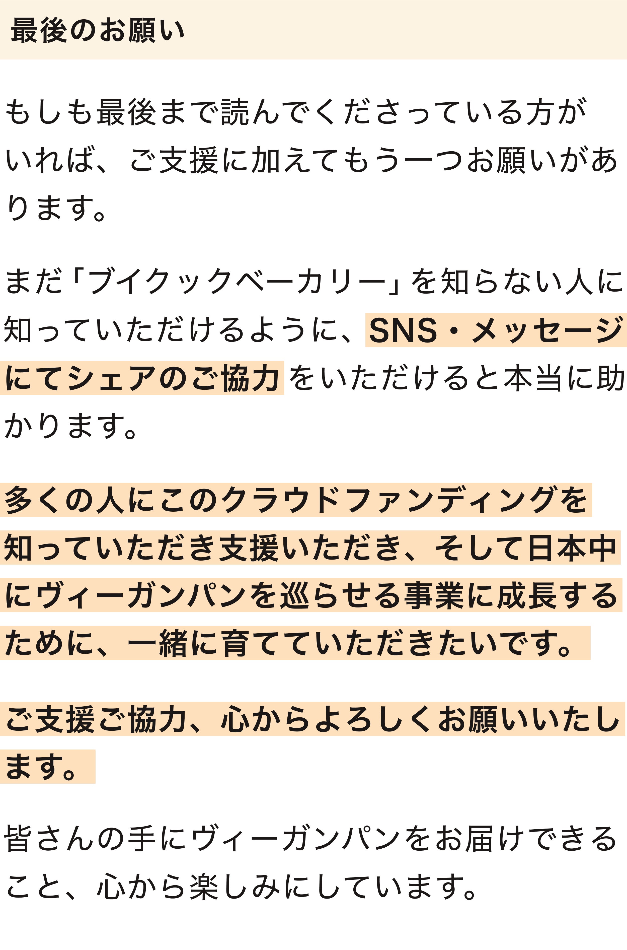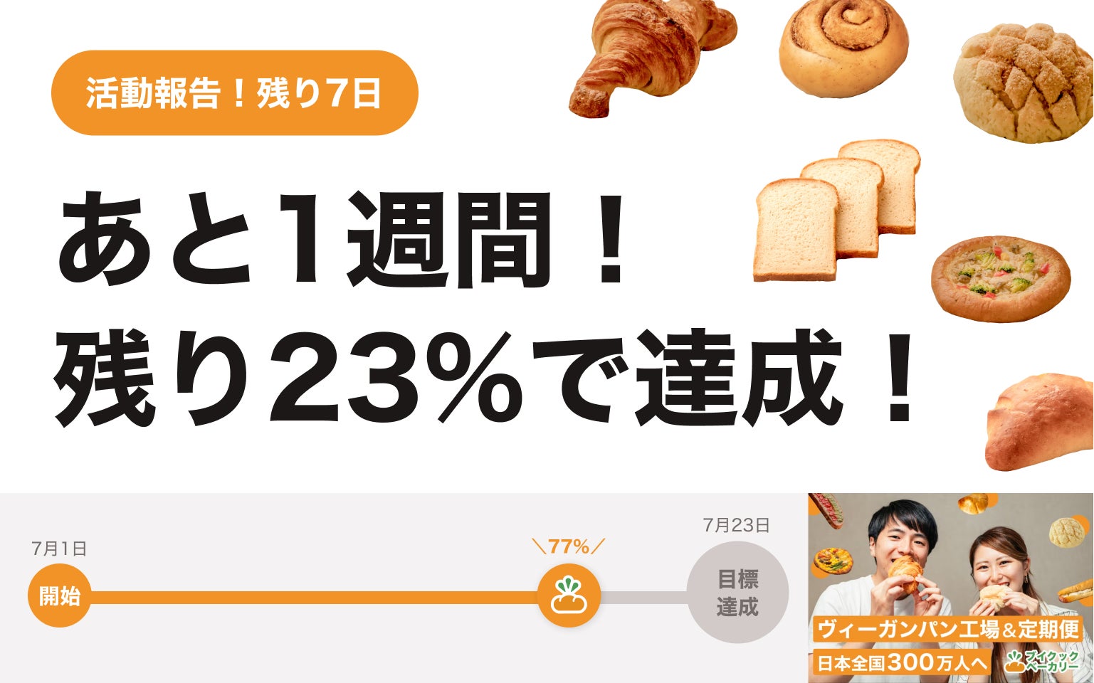 2023/07/16 21:45ヴィーガンパンの工場&定期便「ブイクックベーカリー」のクラウドファンディング、終了まで残り1週間となりました!開始から約2週間で、221名にこのプロジェクトに共感いただけたこと、そして本当に多くのシェアのご協力をいただけてこと、改めて感謝です。ありがとうございます。開始から2週間、現在の結果・支援金額:1,339,038円・支援者数:221人・達成率:77%これだけ多くの方に、ヴィーガンパンを求められていること、そしてヴィーガンでも"当たり前"にパンのある日常を取り戻すことに共感いただけたことに、すごく励みになっています。クラウドファンディングを始める前に抱いていた課題感が「間違っていなかった」と確信にいたりました。日本全国のヴィーガン300万人をはじめ、フレキシタリアンや興味のある方々が、手軽にヴィーガンパンを食べられる社会を実現させるために、最後までにプロジェクトを走り切ります。残り7日間で、あと23%です。僕たちブイクックからアプローチできる方々には届けきり、あとは皆様のSNSなどでのシェアで、さらに多くの人に知っていただけるかどうかが鍵になります。クラウドファンディング開始から、多くの方々にSNSでシェアのご協力いただき、本当にありがとうございます。残り1週間。僕たちと一緒に"ヴィーガンパンのある日常"を取り戻すために、SNSでの発信のご協力をお願いします。また、その際はブイクックスーパーのInstagramアカウント(@vcooksuper_vcook)へのメンションも、ぜひお願いします。そして、最後に嬉しいコメントをご紹介させてください。たくさんの応援と期待のコメントに胸があつくなって、同時に「絶対にやり切るぞ」と気が引き締まっています。素敵なコメントをくださったみなさん、本当にありがとうございます!ここに掲載できなかったコメントもたくさんあるので、ぜひコメント一覧をご覧ください。今回の「ブイクックベーカリー」クラウドファンディングは、100名以上の応援団の方々と一緒に、公開前から作り上げてきました。まだまだ応援団を募集しておりますので、「一緒に最後1週間を盛り上げたい!」という方は、LINE OpenChatにご参加いただけると嬉しいです。匿名で参加できるので、ぜひ参加いただき一緒に「ブイクックベーカリー」を世の中に知らしめてください...!▶︎ブイクックベーカリー応援団(LINE OpenChat) もっと見る
