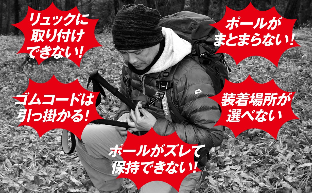 今は使わないけど、出番が来たらすぐ取り出したい! また、小型リュックだとポールの取り付けができないものも結構多いですよね。それに市販のゴムコードホルダーはすぐ伸びるし引っ掛かるので使いづらい…と思うことはないでしょうか?