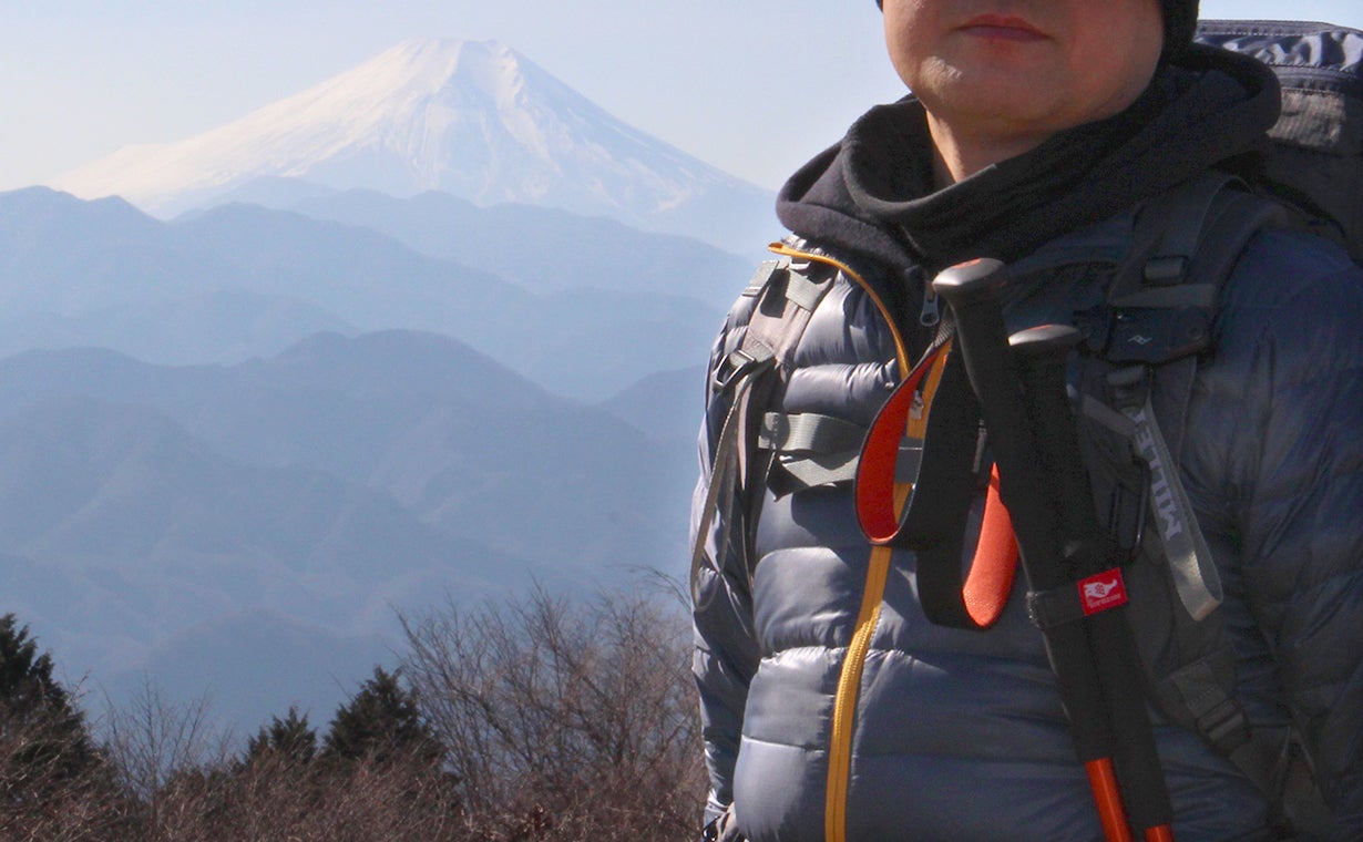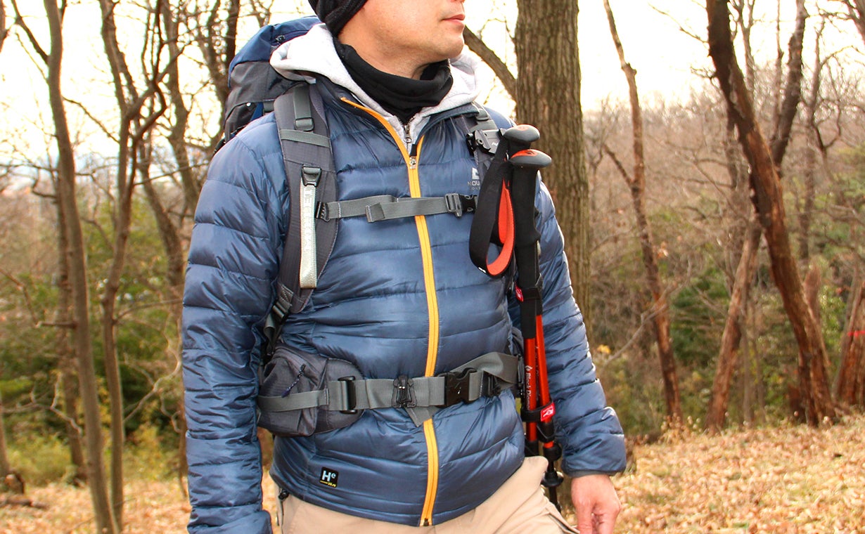 リュックのショルダーストラップに沿って脇差のように装着できるので登山行の邪魔になりません。