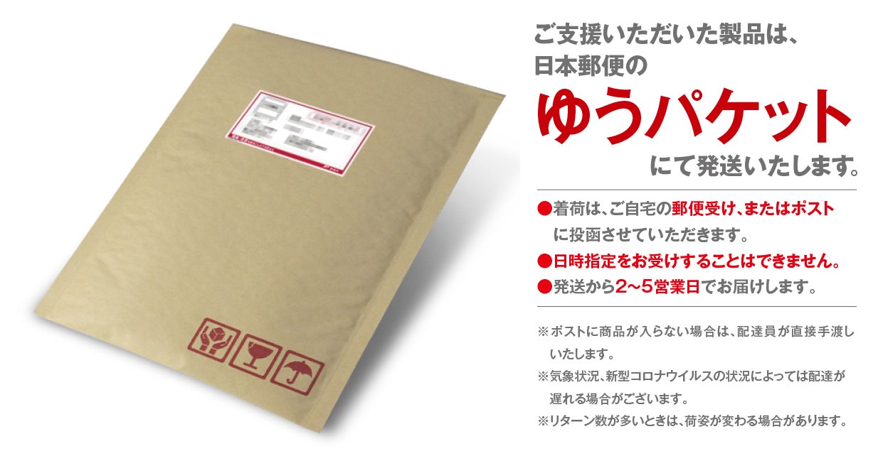 ◯引渡し時期: 各リターン詳細に記載の発送予定⽉を引き渡し時期とします。但し、開発・⽣産状況によって遅れが⽣じる場合がありますのでその際は当プロジェクトページ内の「活動報告」または購⼊者へのメール等で連絡します。