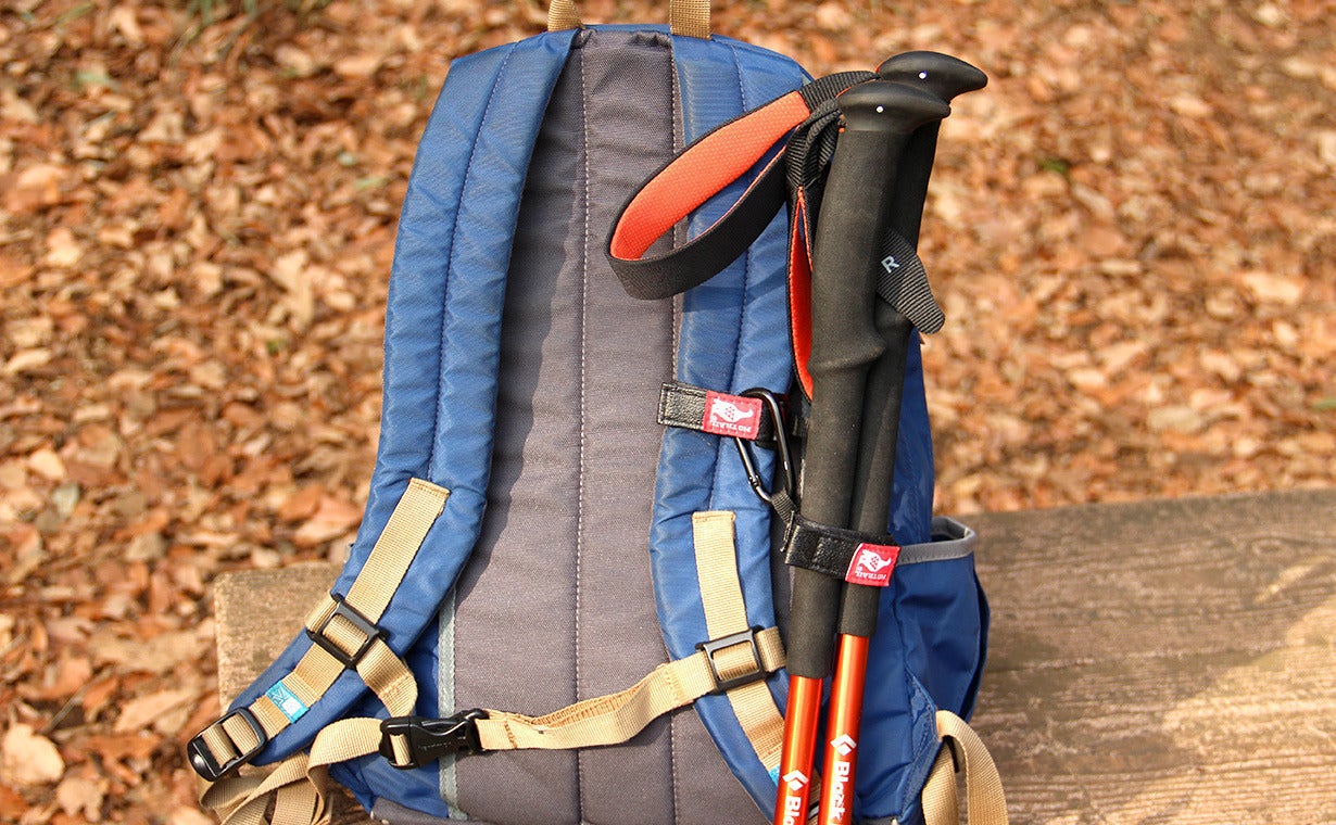 トレッキングポール用のポケットやループが無かったり、カラビナを付けられない場合は、ベルトを組み合わせることでポールを装着できます。