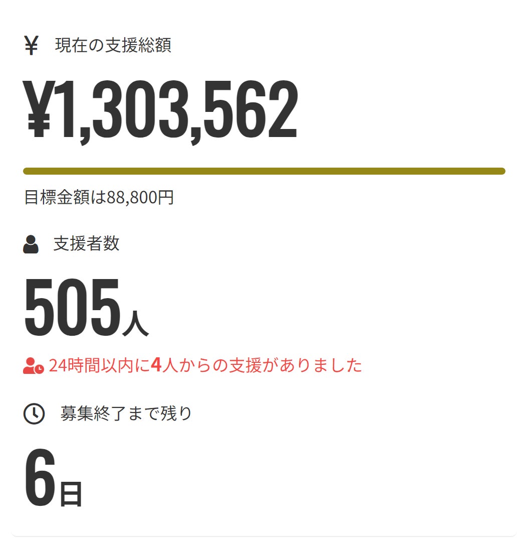 いよいよ本日プロジェクト最終日となりました!最後の最後でご支援者様も600人を突破しました。ご支援いただき本当にありがとうございます(^^ラスト数時間ではございますが最後までよろしくお付き合いくださいね。