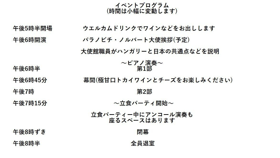 前回の大使館イベントの際、ご挨拶していただいたパラノビチ・ノルバート駐日ハンガリー大使は「ハンガリーが世界に誇る音楽と料理とワインの3つを同時に楽しめるイベント」と評価してくださいました。イベント時の大使館職員の説明では、親日国・ハンガリーと日本の共通性もお話いただけますので、イベントに参加してハンガリーを大好きになっていただけたらと願っております。よろしくお願い致します。