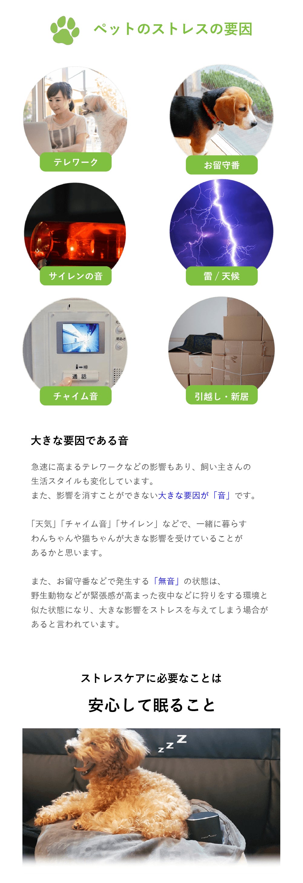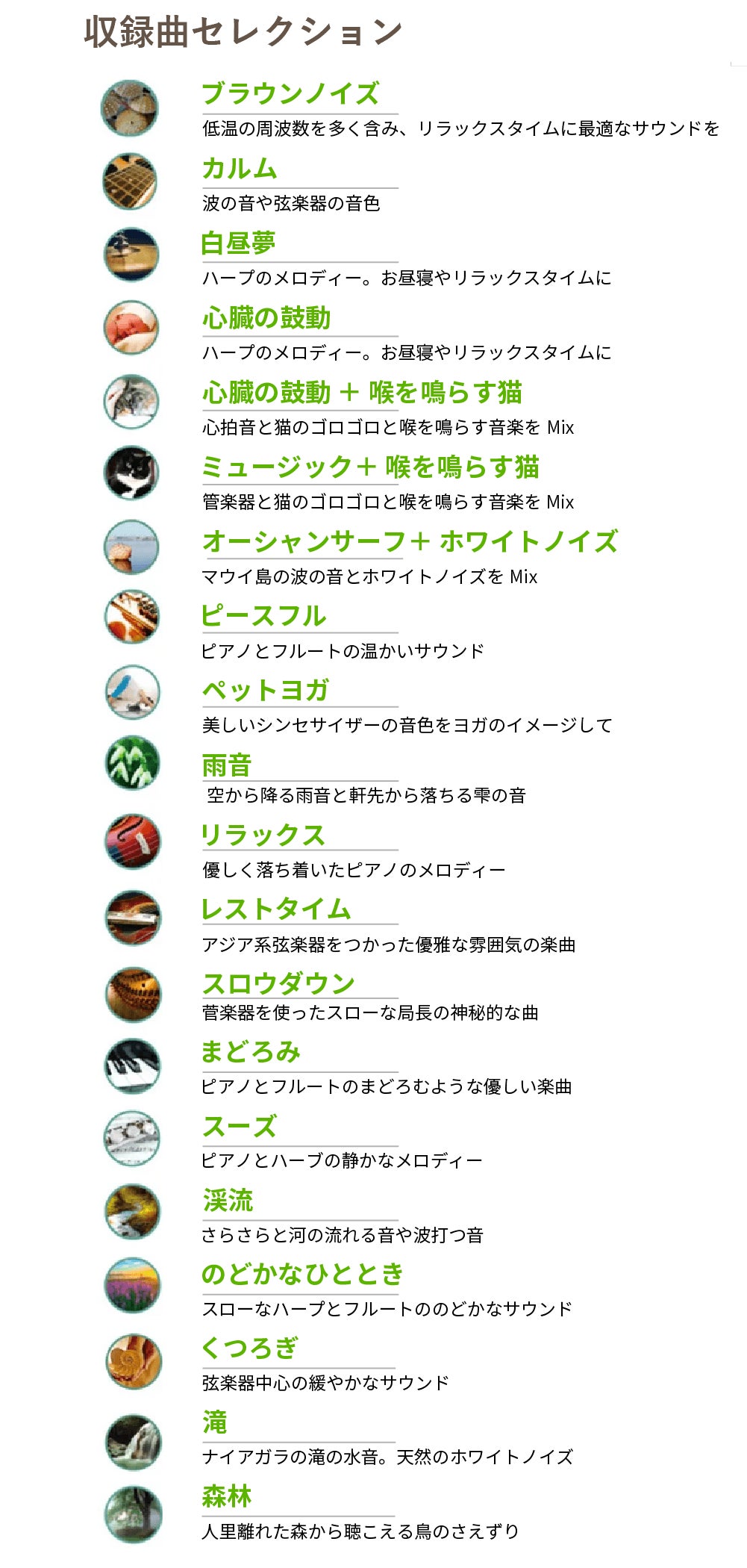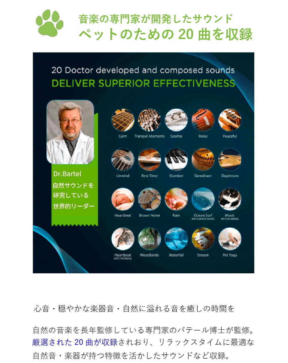 音の専門家が開発した「ペットがリラックスするための20曲」を収録。