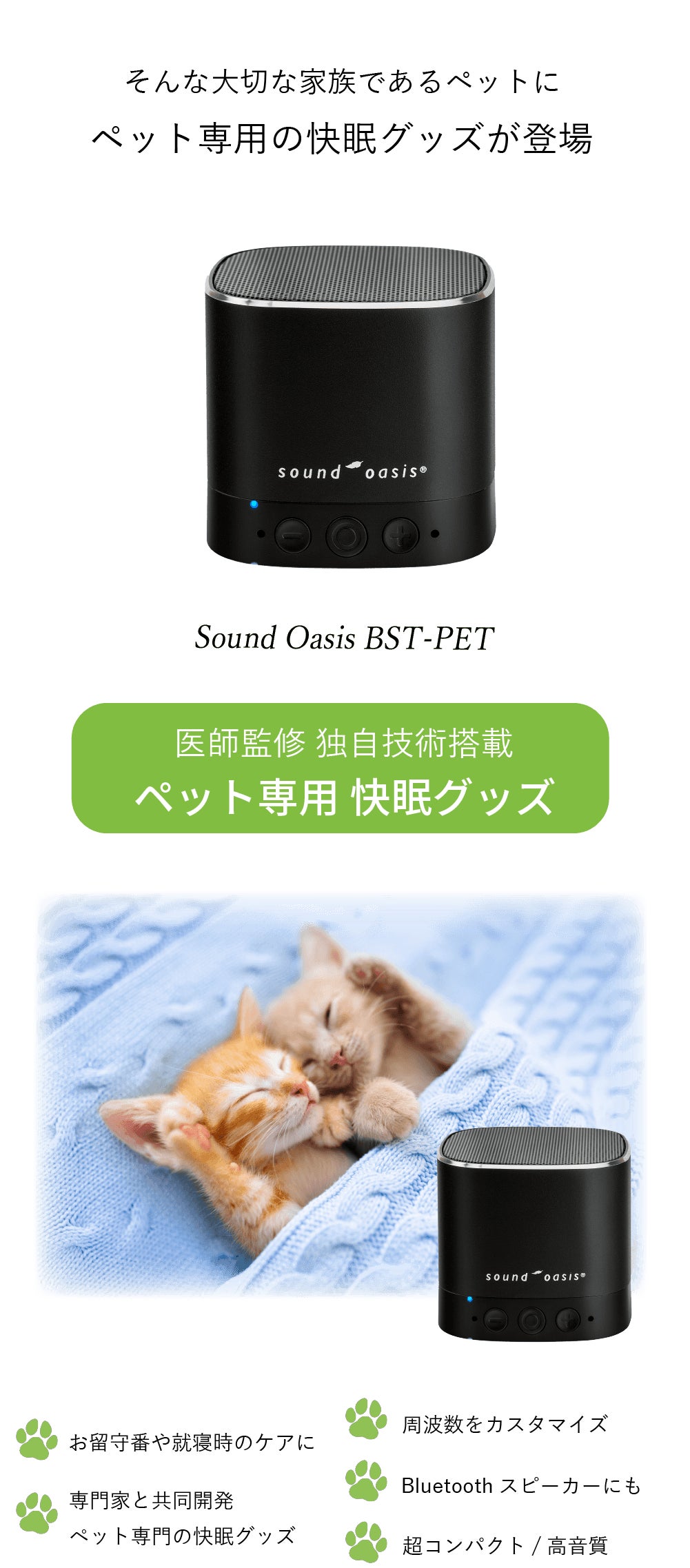 サウンドオアシス社はこれまで多くのサウンドに関する製品を発表しておりました。今回、ご支援者、お客様からの多くのご意見を今回発売いたします最新モデル、サウンドオアシスペットに取り入れ、新しいサウンドケアをお届け出来ることなりました。