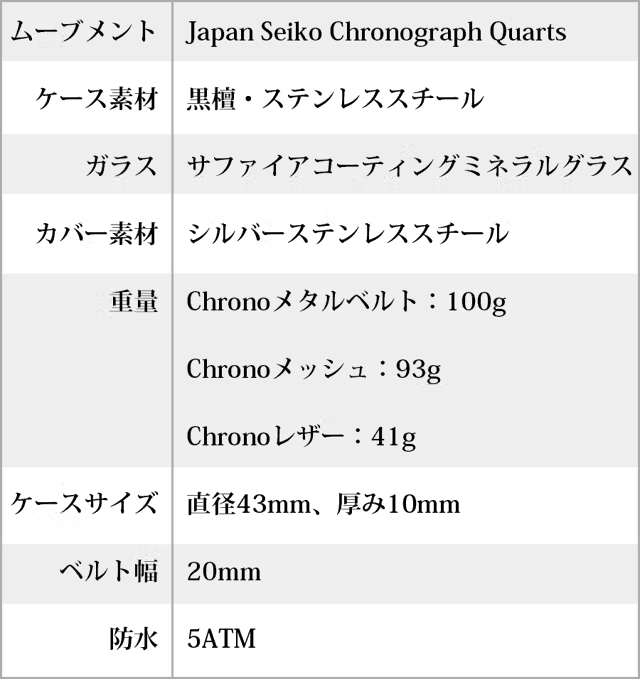 腕時計の心臓部でもあるムーブメントには、正確に時を刻み、世界的にも定評のあるSeiko Chronograph Quartsを採用。