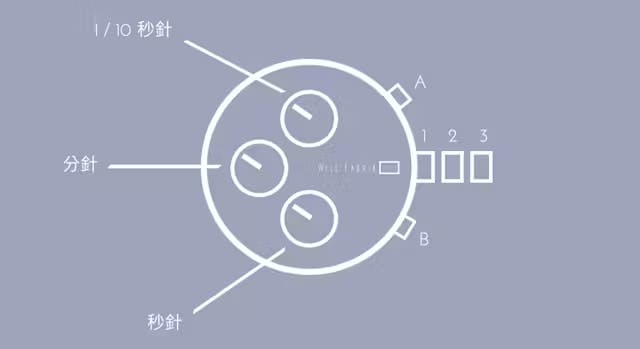 ※3つのダイアルが正常に稼働していない場合は、リューズを引くことと、ボタンAとB押すことを同時に2秒以上行ってください。その後、それらのボタンから手を放すと、全3つの針が「0」の位置まで回転します。これによって内部電子回路がリセットされたことになります。