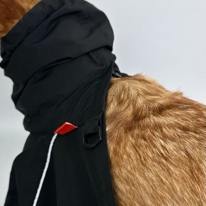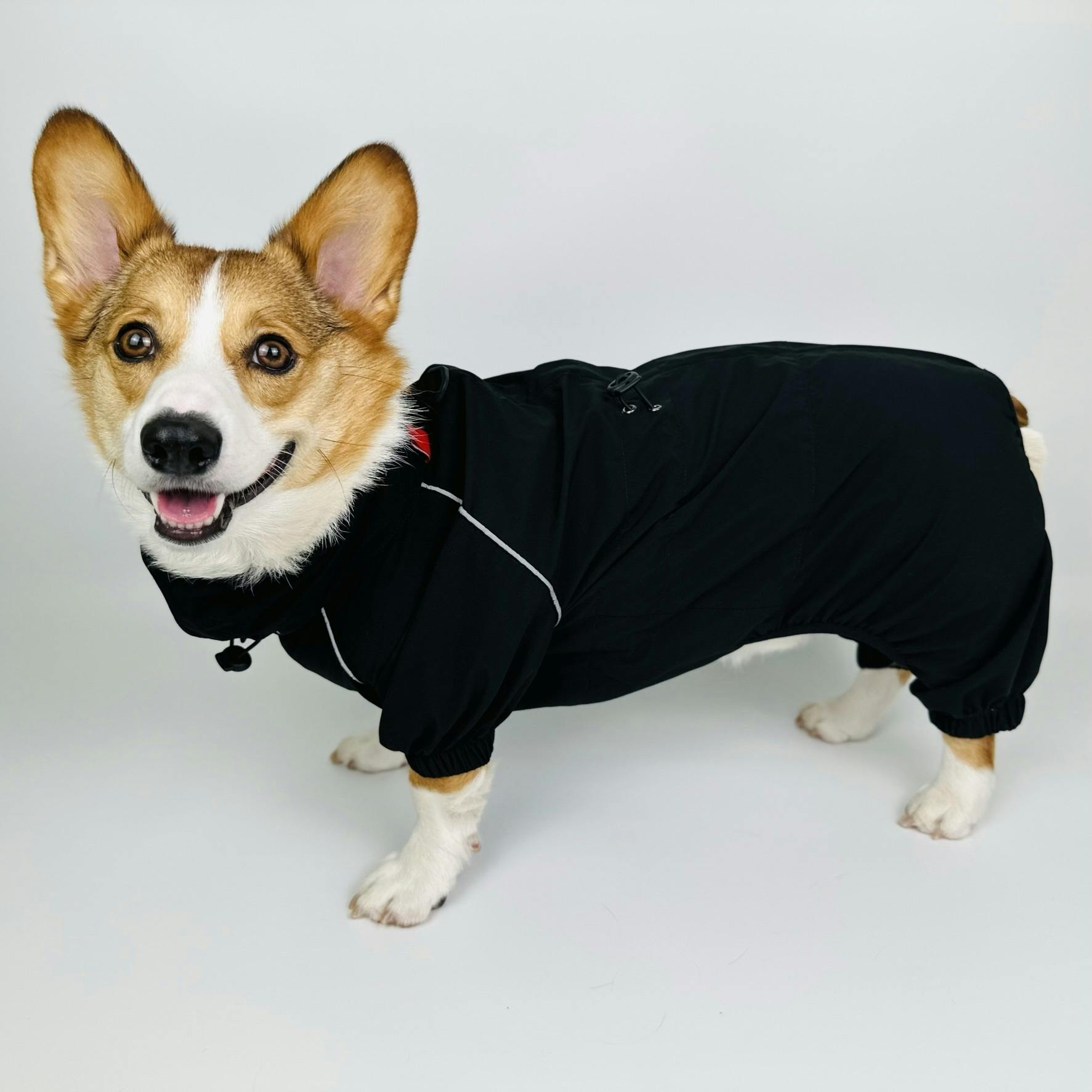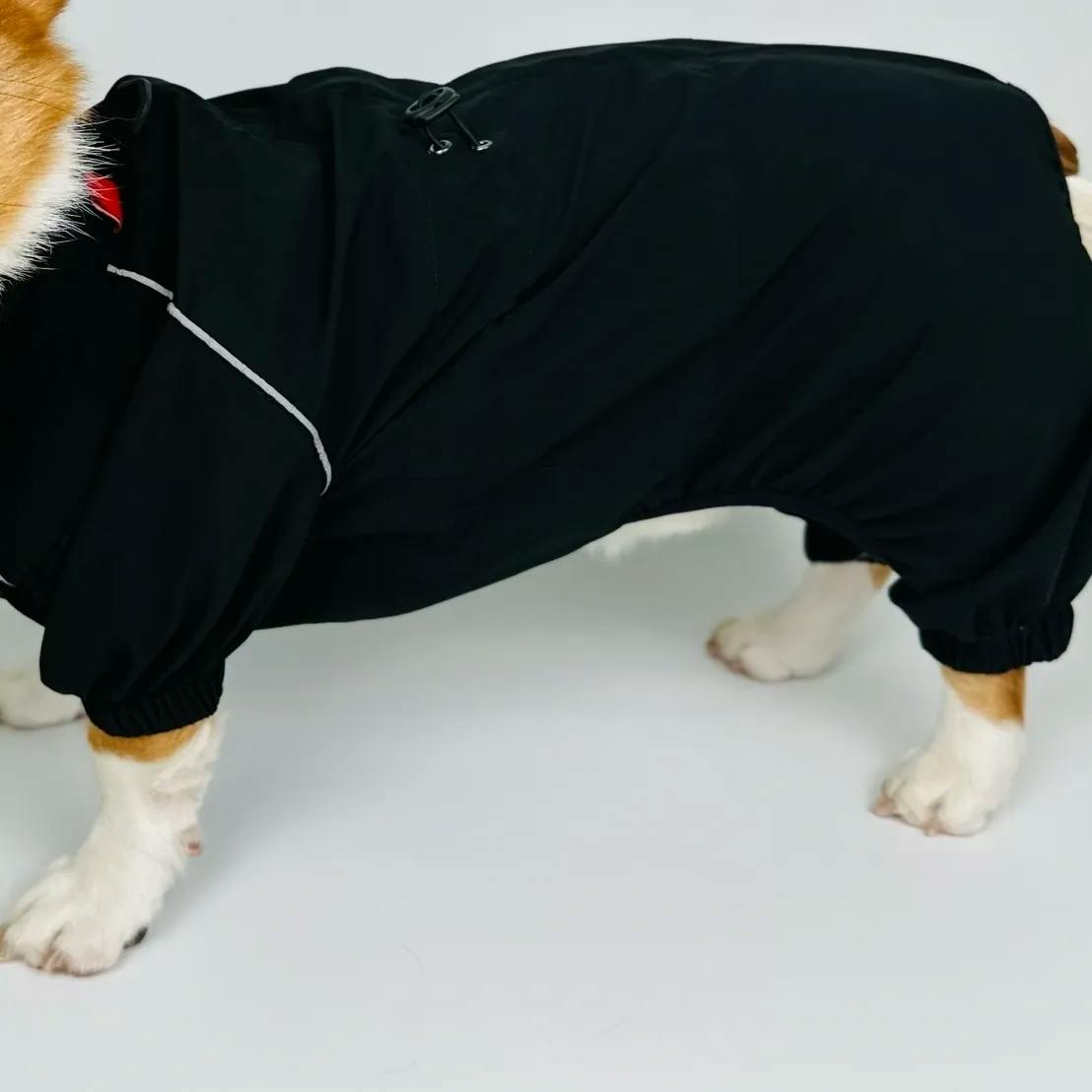 犬種兼用タイプのレインコートでは実現できない、足の長さ、胴長がピッタリのレインコートになり、足回りのゆるみ、締め付けがない設計にしました。
