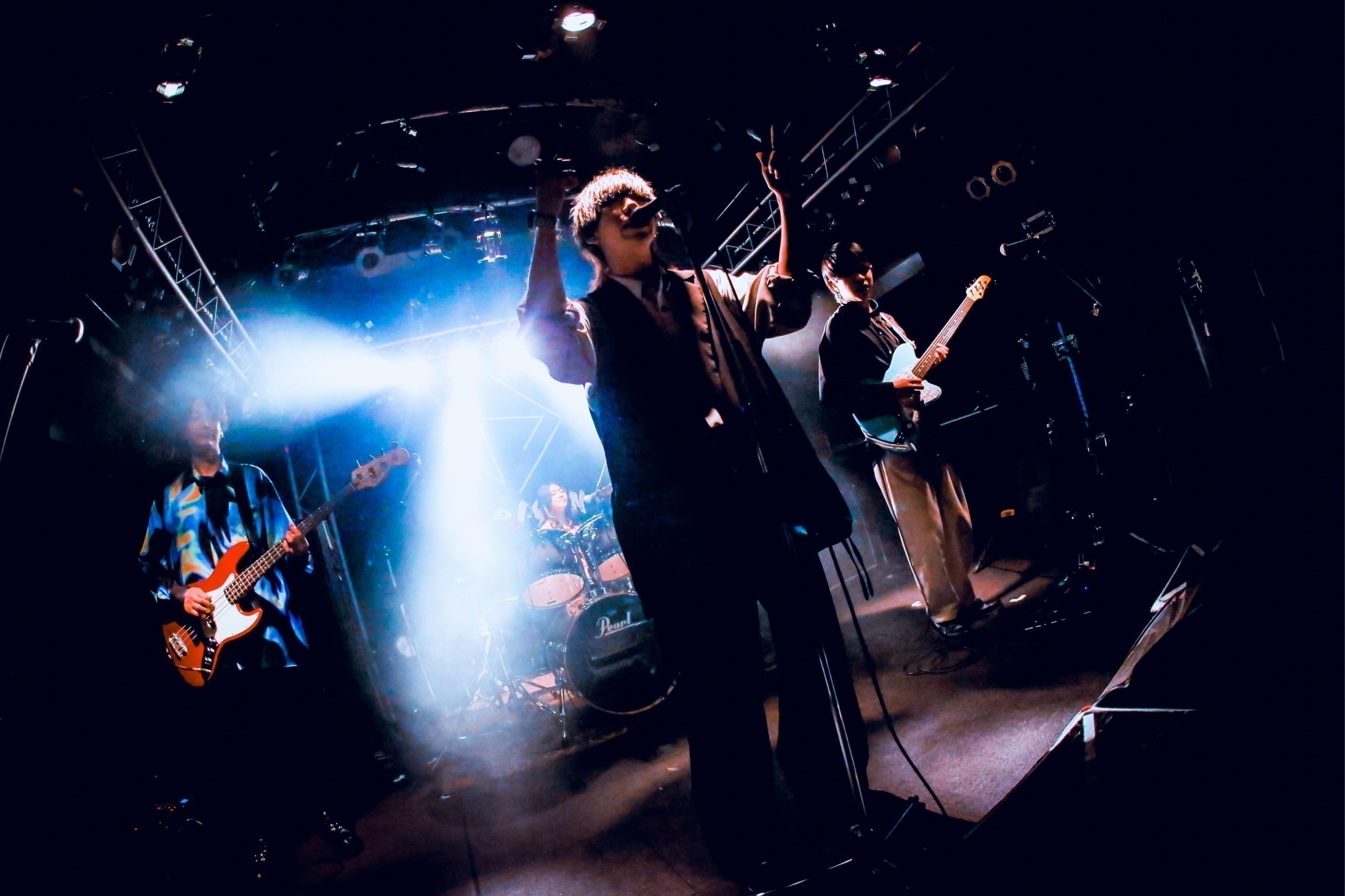 Vo.くにが27歳、Ba.がみが30歳、Dr.きょんが21歳です。