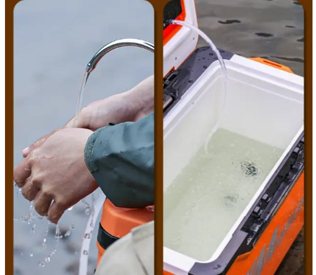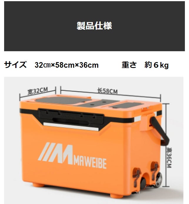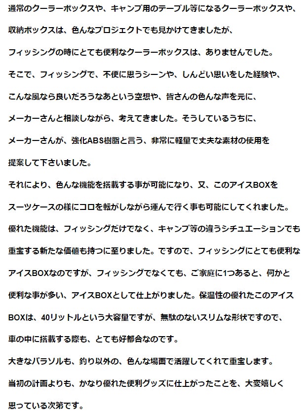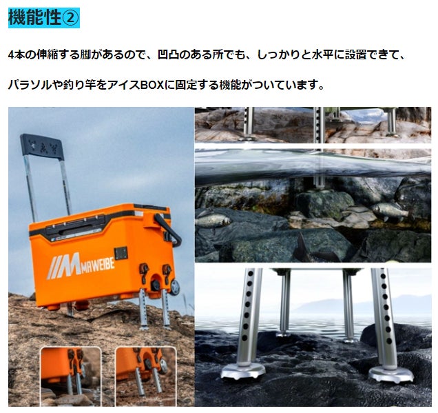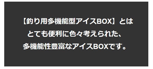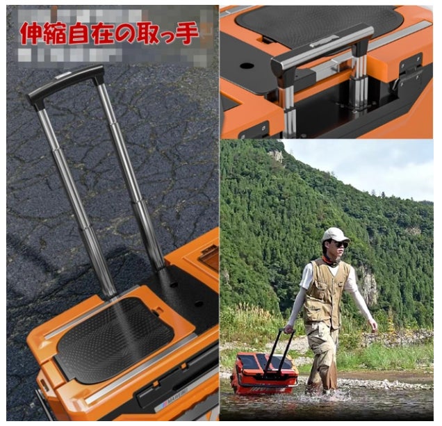 釣りに必要な小物を整理して全て収納し、釣り場で日傘や釣り竿を固定設置できて、しかも背もたれがある椅子になり、フローティングスカリで泳がしていた魚を最後に氷詰めにして持って帰れる、キャスターや伸縮自在の取っ手がついた、多機能性豊富なアイスBOXです。