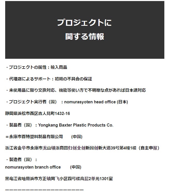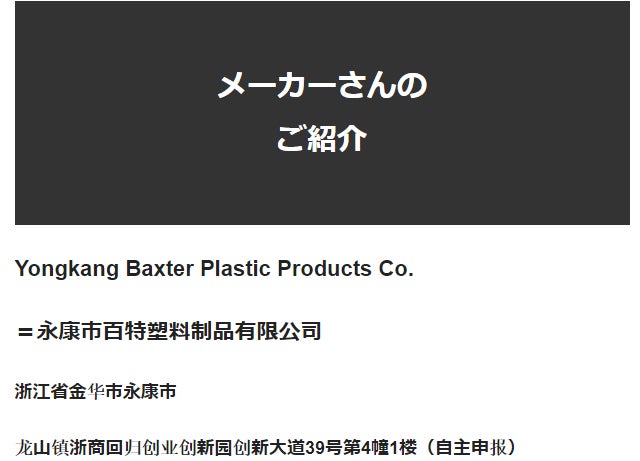 メーカーさんである、Yongkang Baxter Plastic Products Co.さんは、今回初めてですが、長年物販のお付き合いがあります、Hachistrong-Monica=广州八端进出口有限公司さんと、国内の数社の配送業者さんとはいつも連携させていただいております。又弊社は、中国のクリエ―ターでありメーカーさんである