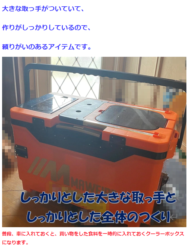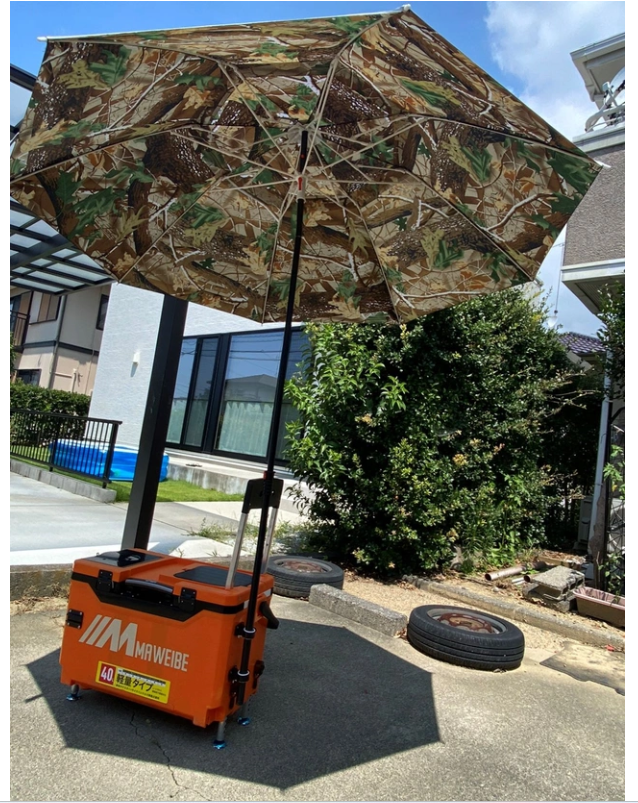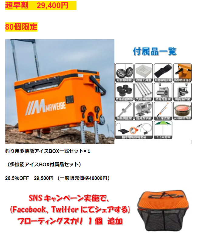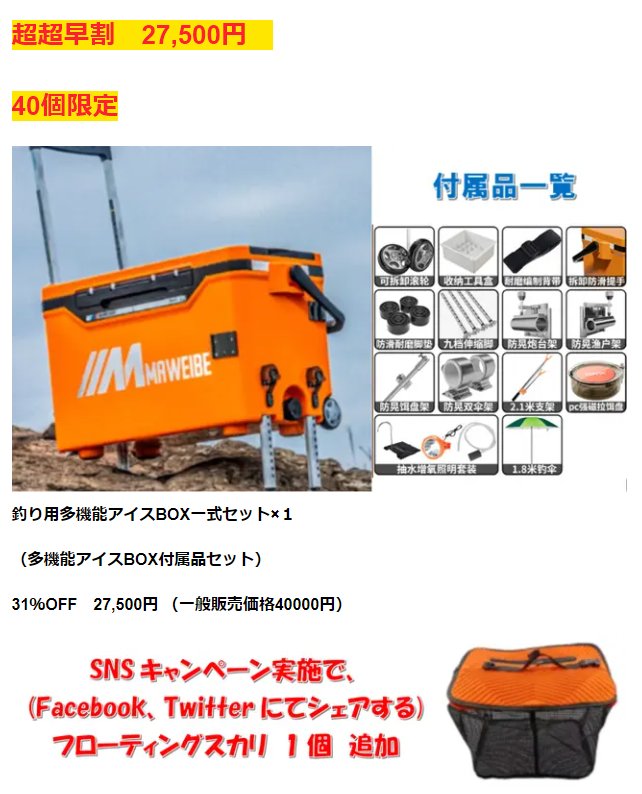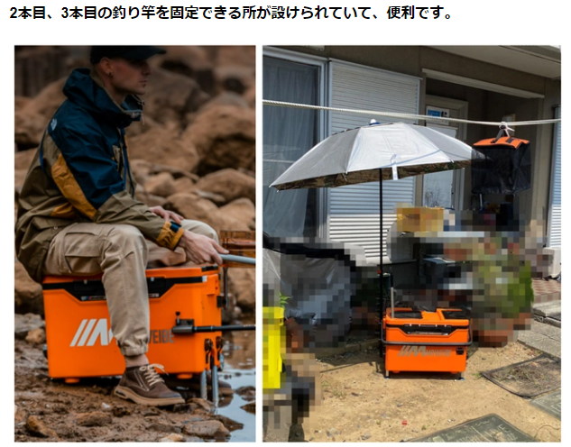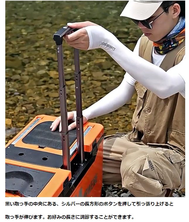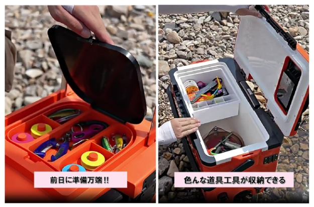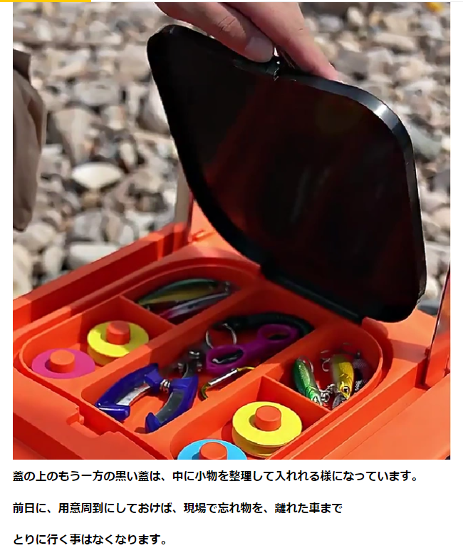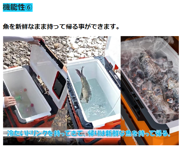 釣りに必要な小物を整理して全て収納し、釣り場で日傘や釣り竿を固定設置できて、しかも背もたれがある椅子になり、フローティングスカリで泳がしていた魚を最後に氷詰めにして持って帰れる、キャスターや伸縮自在の取っ手がついた、多機能性豊富なアイスBOXです。