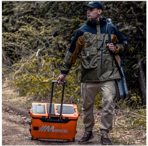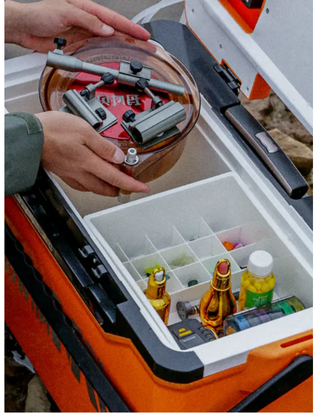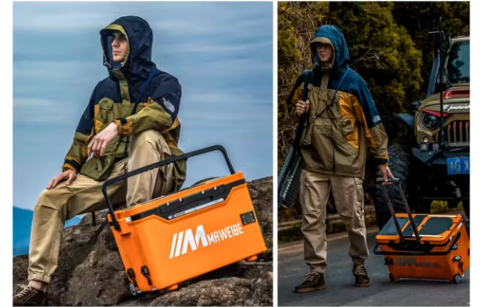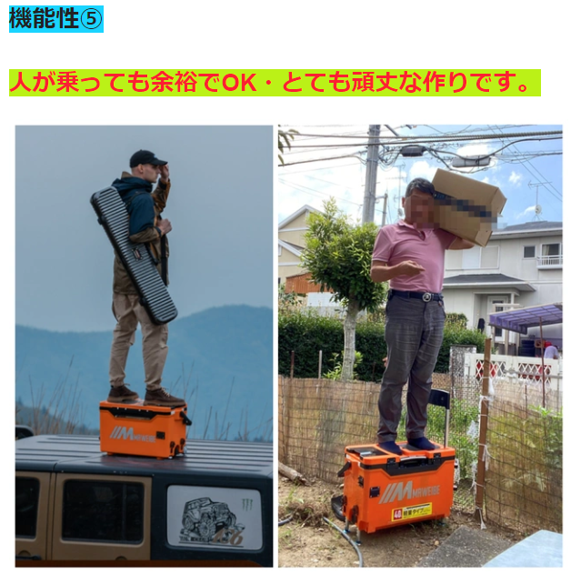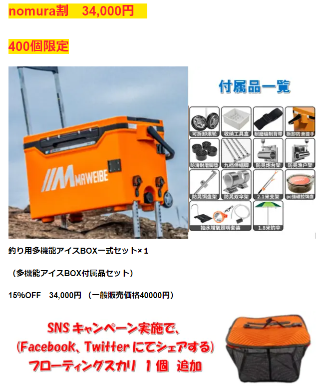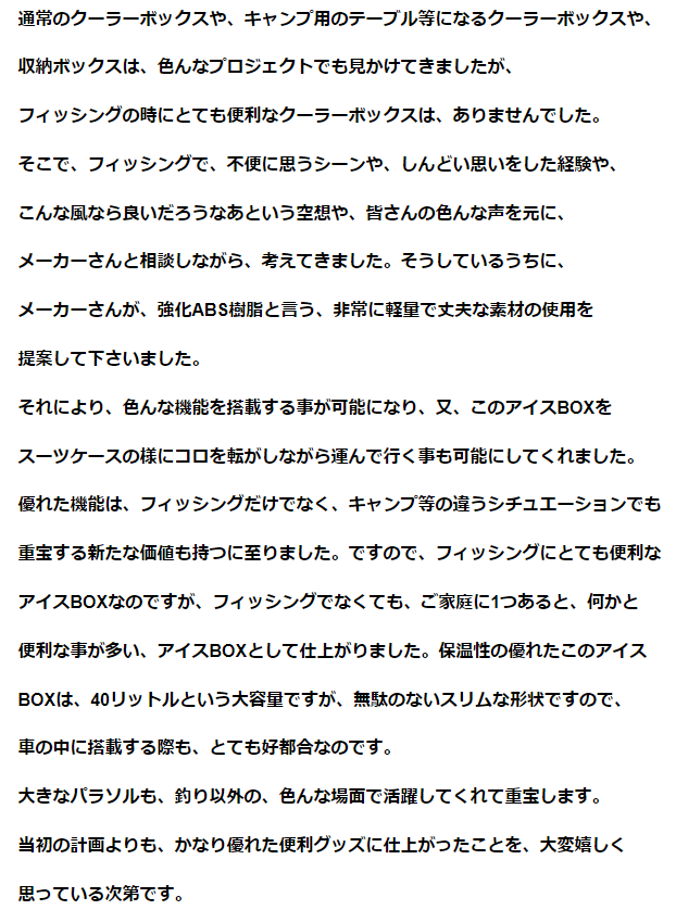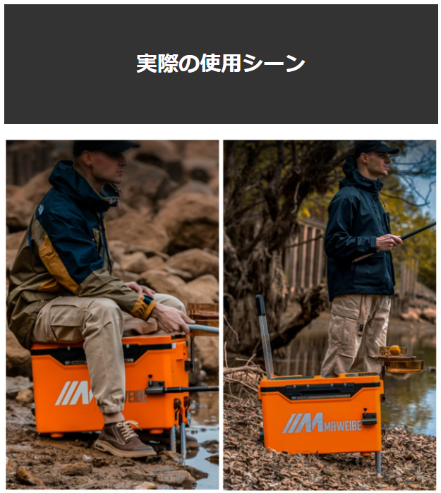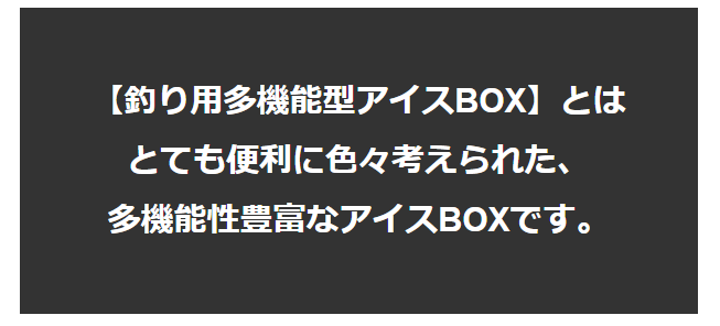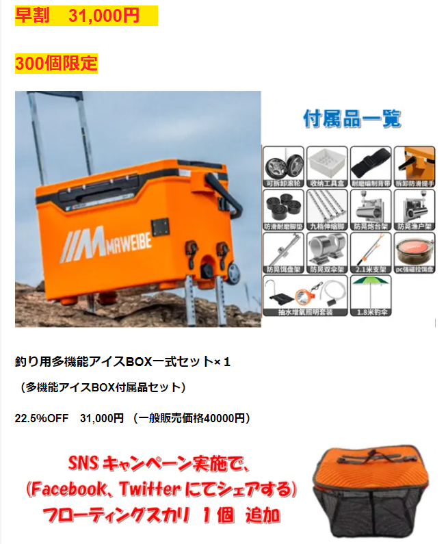釣りに必要な小物を整理して全て収納し、釣り場で日傘や釣り竿を固定設置できて、しかも背もたれがある椅子になり、フローティングスカリで泳がしていた魚を最後に氷詰めにして持って帰れる、キャスターや伸縮自在の取っ手がついた、多機能性豊富なアイスBOXです。