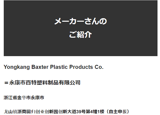 メーカーさんである、Yongkang Baxter Plastic Products Co.さんは、今回初めてですが、長年物販のお付き合いがあります、Hachistrong-Monica=广州八端进出口有限公司さんと、国内の数社の配送業者さんとはいつも連携させていただいております。又弊社は、中国のクリエ―ターでありメーカーさんである