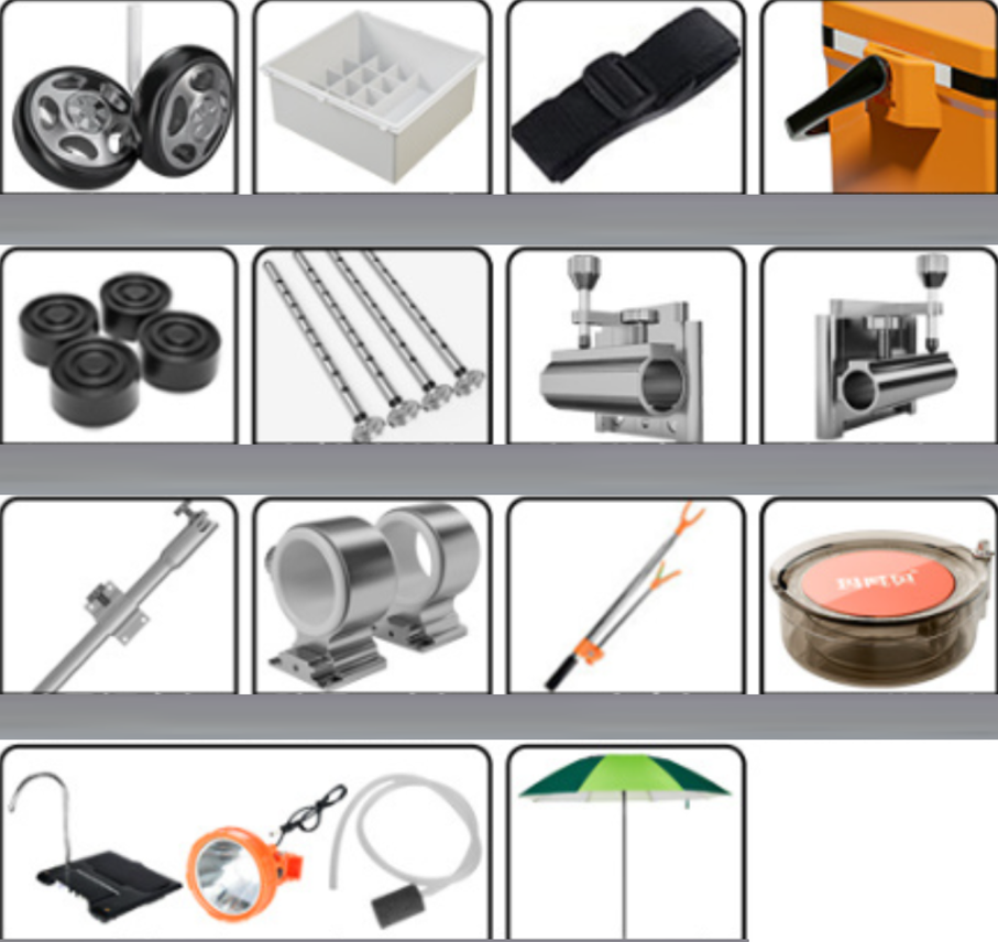 キャスター、釣り用品収納BOX、ショルダーストラップ、取っ手、脚滑り止め、伸縮調節脚、釣り竿固定パイプ、パラソル固定部品、ライト、特大パラソル、取扱説明書、等