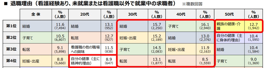下記の厚労省からの退職調査から読み取れるように、20代で注目すべき問題は健康(精神的理由)が第4位となっていることです。また、50代では健康(身体的理由)が第2位となっています。国家資格を取得し、激務な現場へ配属され、心身ともに疲労困憊していると思われます。