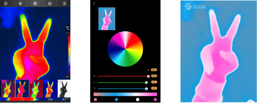 一般的なサーモグラフィは高熱を赤系で、低温を青系で表現しますが、Mobirシリーズでは専用アプリを使うことで、この色の変化を自分好みにカスタマイズできます。